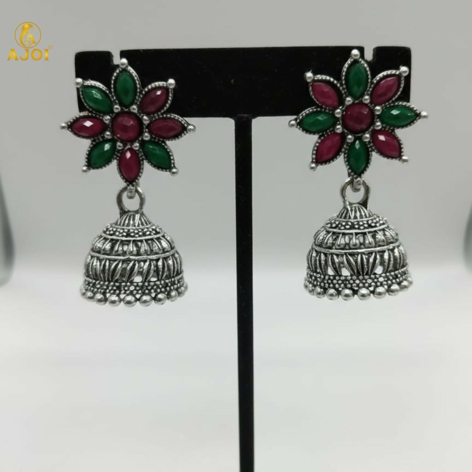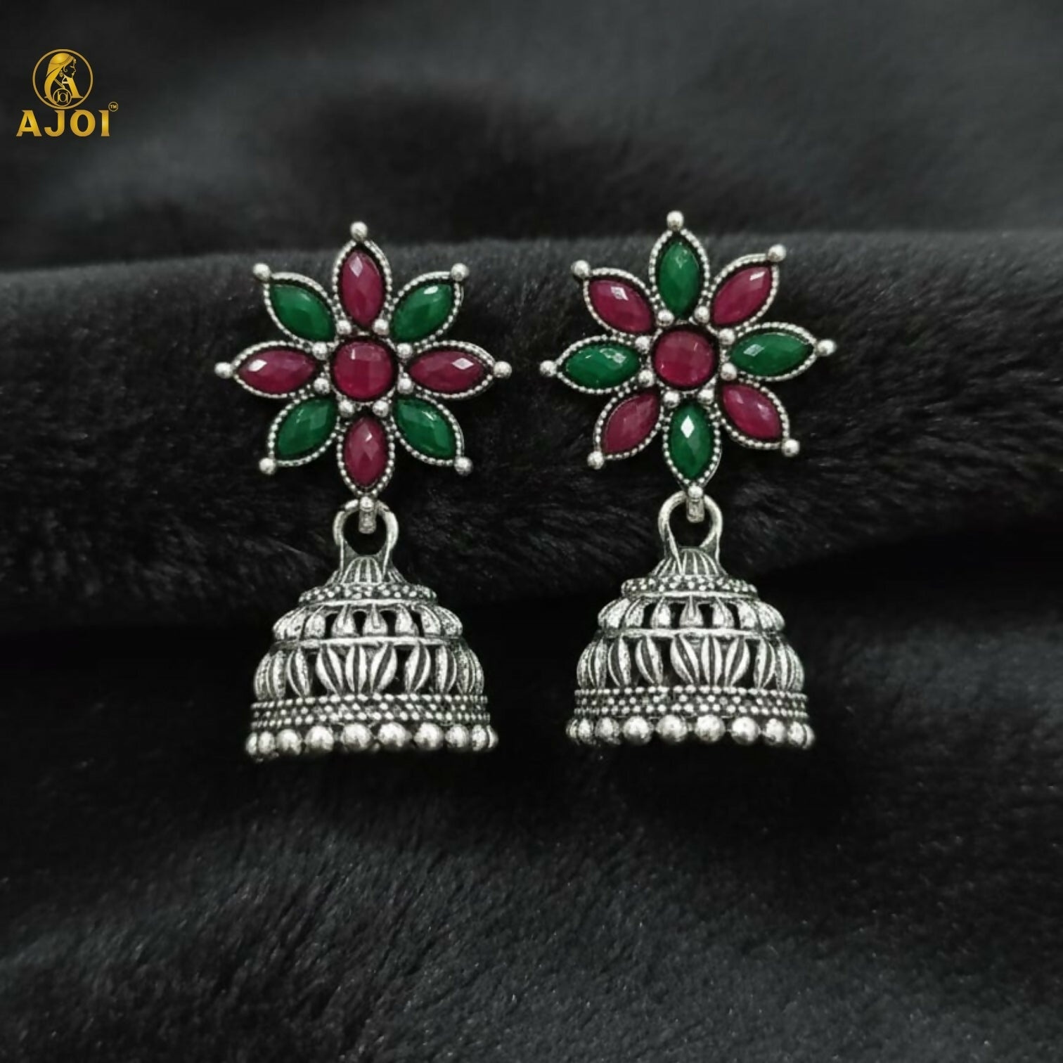 An ode to timeless Indian elegance, Shringara Ratnam earrings are crafted to celebrate beauty, artistry, and tradition. The exquisite floral stud is embellished with rich ruby and emerald-toned stones, forming a radiant bloom that reflects royal opulence. Below, a finely sculpted oxidized silver jhumka unfolds in intricate layers, echoing the grandeur of classical Indian ornamentation.
