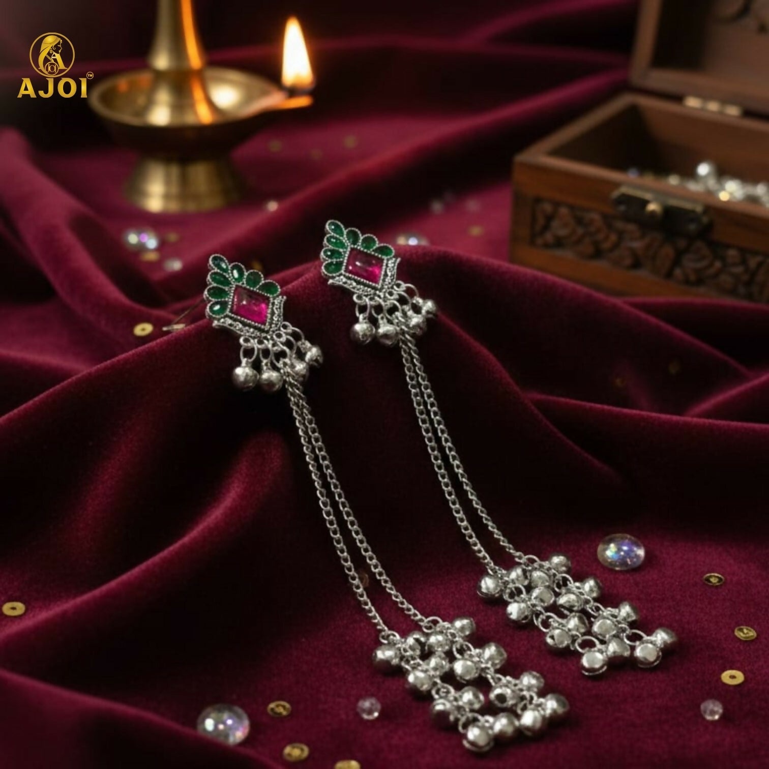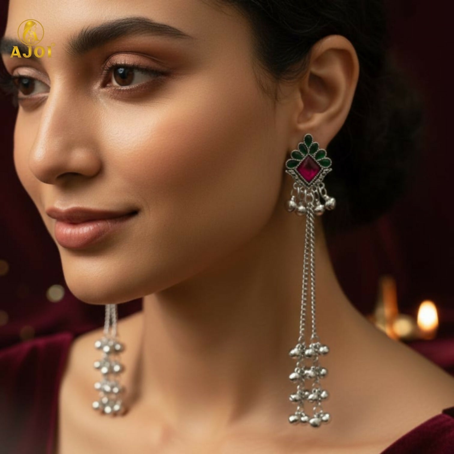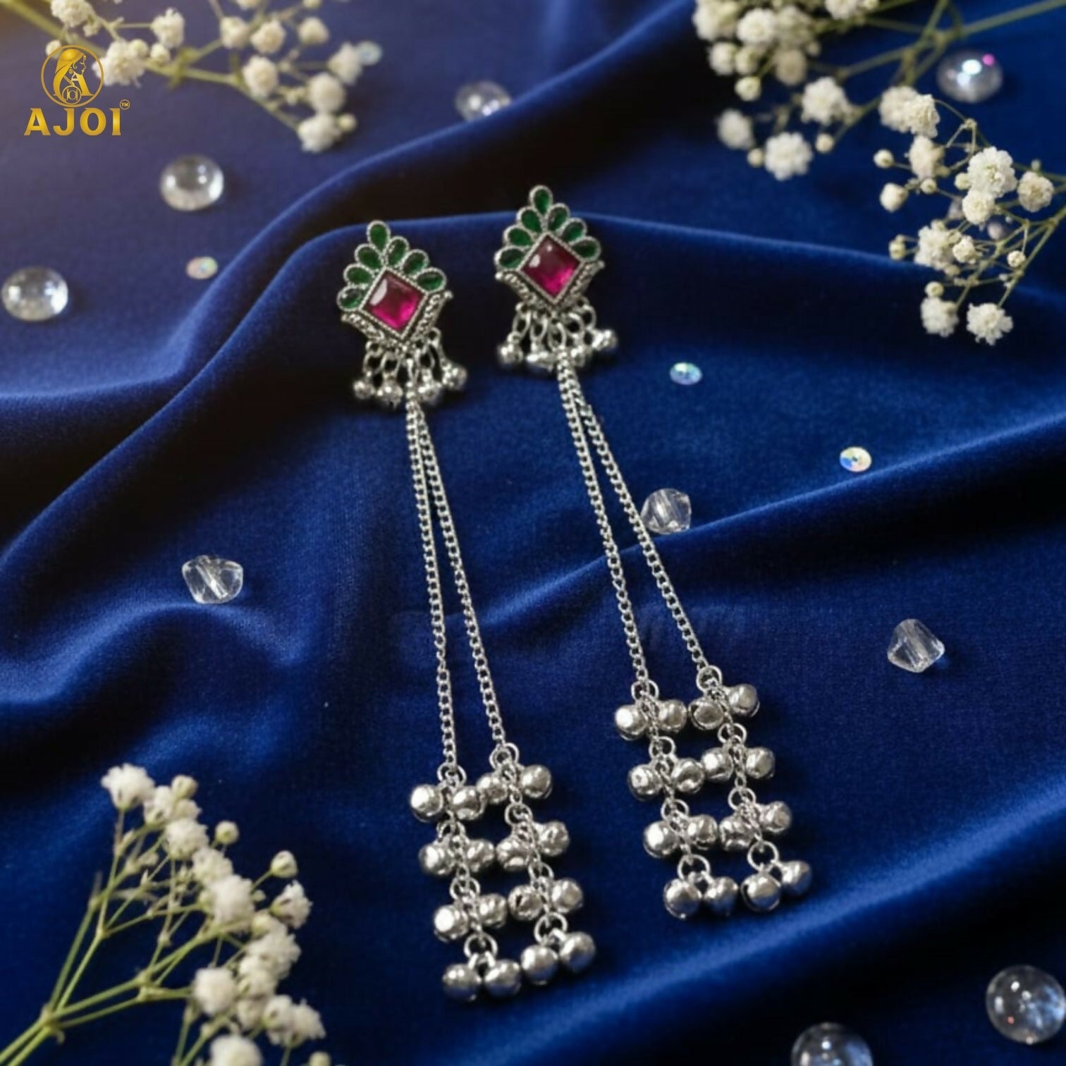 Enhance your ethnic look with these elegant Kashmiri-inspired long chain drop earrings. Featuring a beautifully crafted square stud adorned with vibrant pink stone and green detailing, these earrings are finished with delicate silver-plated chains and charming ghungroo bead drops. The traditional design reflects classic Kashmiri artistry, making them a perfect choice for festive occasions, weddings, and cultural celebrations. Lightweight and comfortable, they pair effortlessly with sarees, lehengas, and ethnic wear.