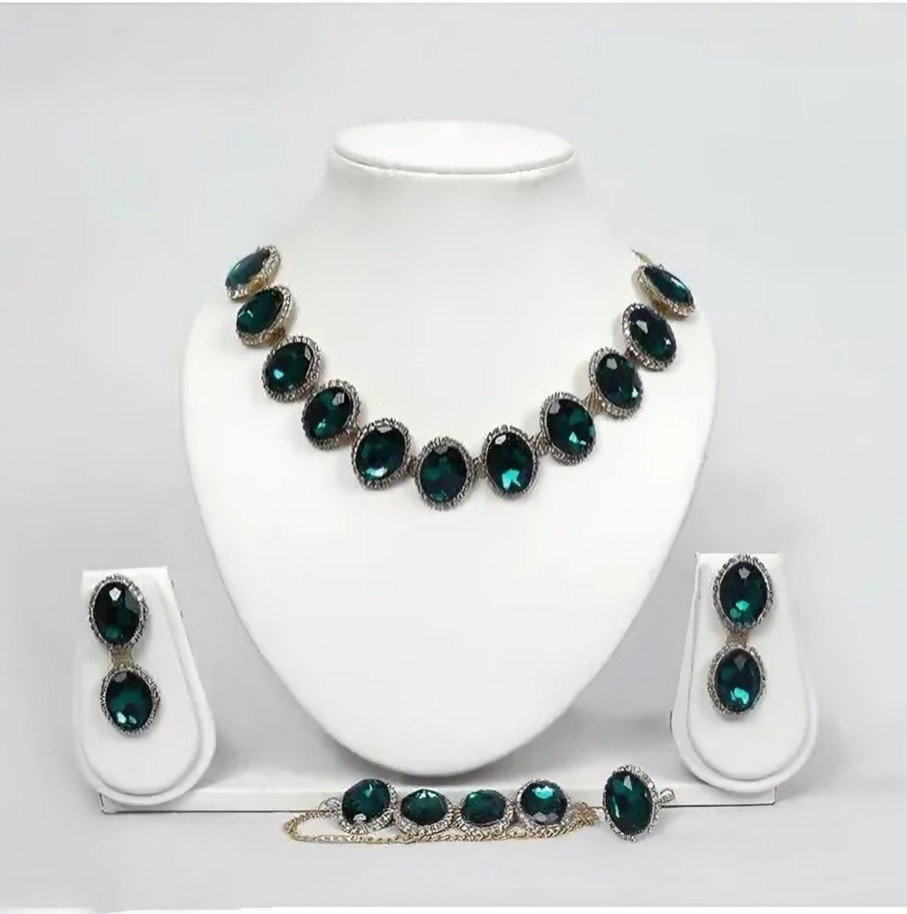 Make a bold and elegant statement with this stunning emerald green crystal jewelry set. Featuring dazzling oval-cut stones framed in shimmering silver-tone settings, this coordinated set includes a necklace, matching drop earrings, a bracelet, and a statement ring for a complete, polished look.