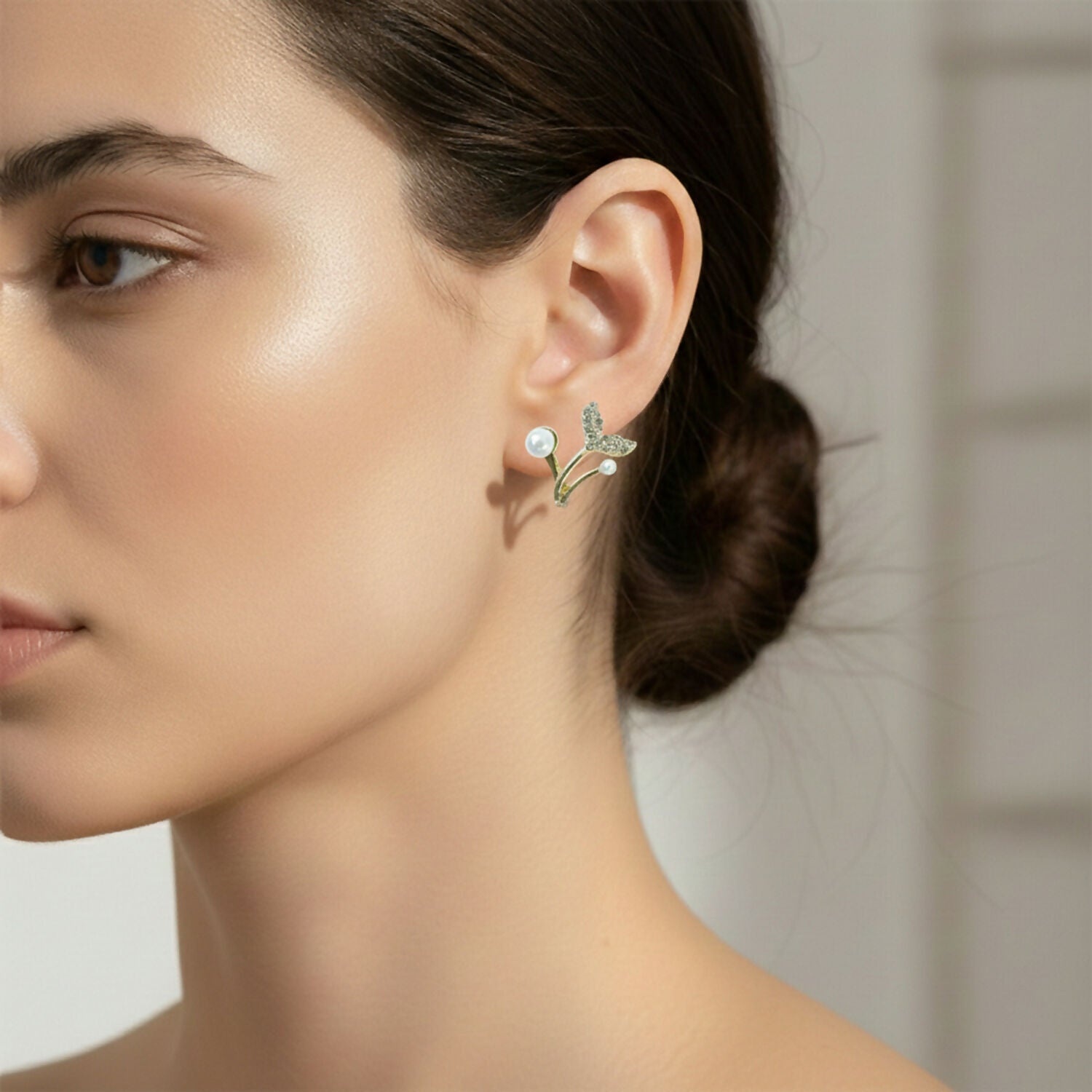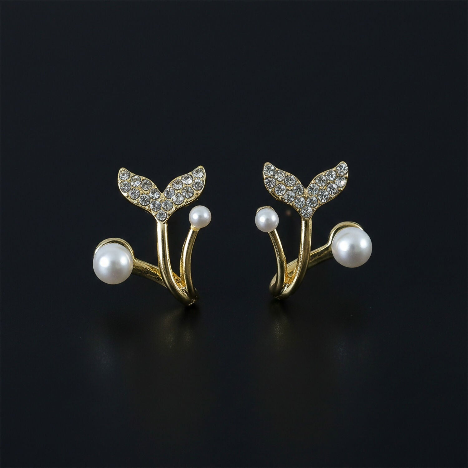 These elegant designer earrings feature a modern open-style structure with a beautiful pearl and stone combination. The upper part is adorned with sparkling stone-studded detailing shaped like delicate wings, adding a glamorous shine to the design. Two curved golden branches extend downward, each finished with smooth round pearls that create a balanced and classy look. The unique shape gives a trendy and contemporary feel while maintaining a soft, feminine charm. Perfect for parties, festive occasions, date nights, and special events, these earrings effortlessly enhance both western and ethnic outfits with a stylish touch.