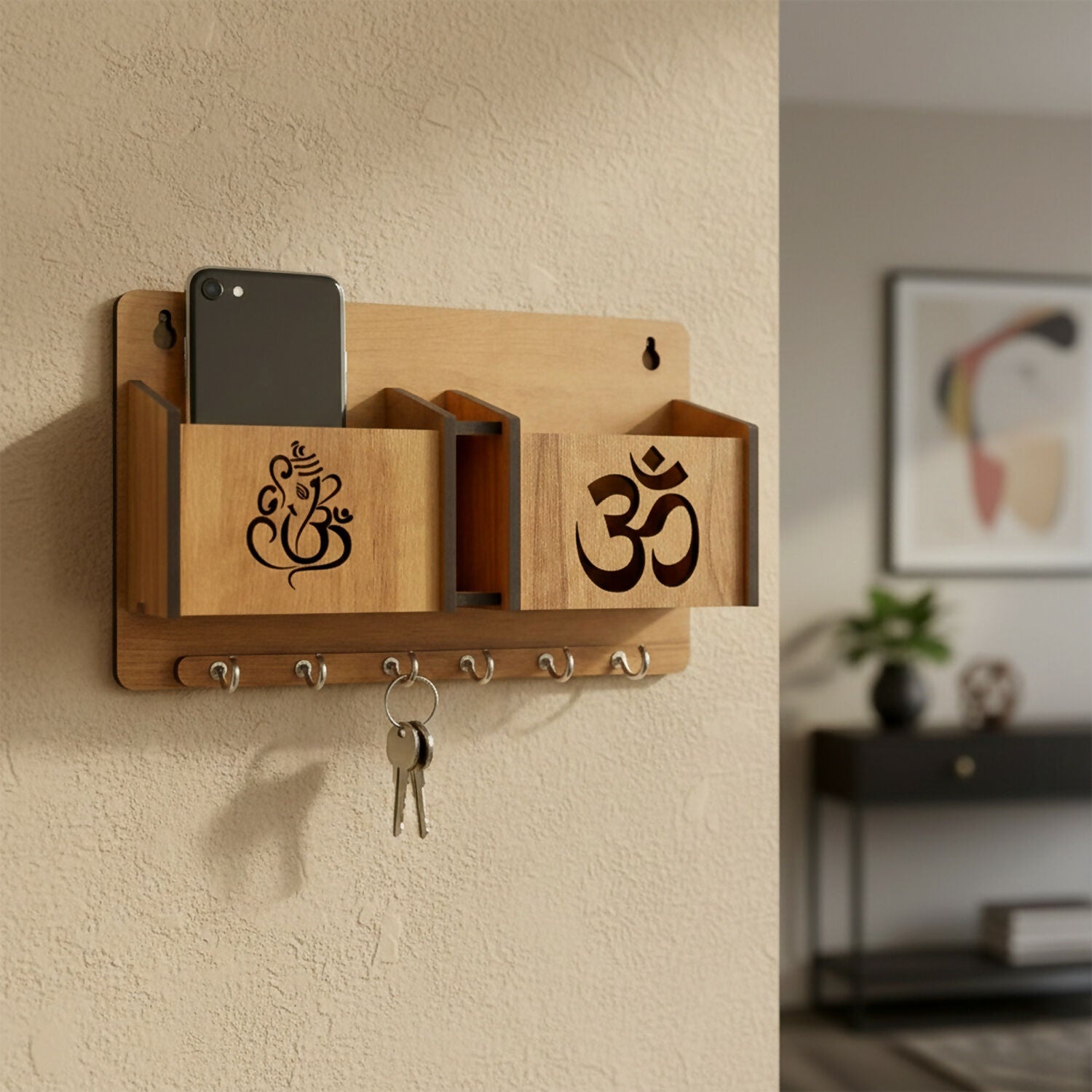 It features multiple storage compartments along with strong hanging hooks for keys, keychains, car keys, and small accessories. The elegant cut-design front adds a decorative touch, making it perfect for home entrances, living rooms, offices, and reception areas.
