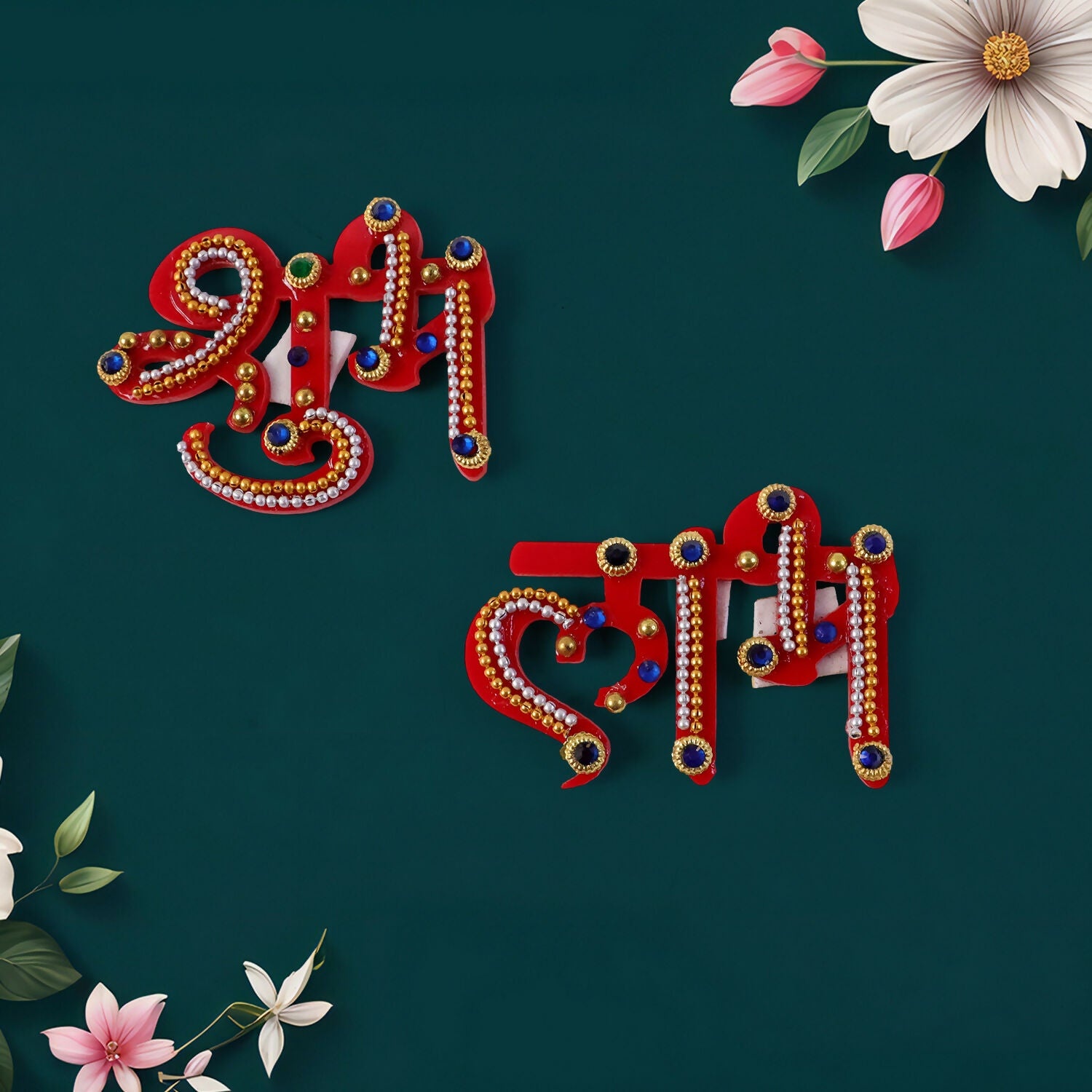 Traditional Shubh Labh door hanging made from premium acrylic in bright red with golden ball chain detailing and colorful stones. Simply stick or hang on your main door, shop entrance, or puja room to invite prosperity and good fortune during Diwali, Navratri, and other auspicious occasions.