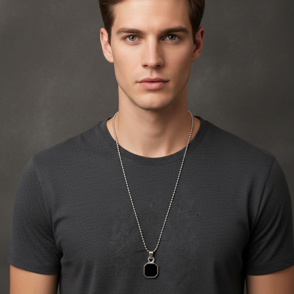 This elegant octagon-shaped black pendant necklace is designed for men who appreciate clean geometry and modern styling. Featuring a smooth black inlay bordered by a polished silver-toned frame, the pendant delivers a bold yet refined look.