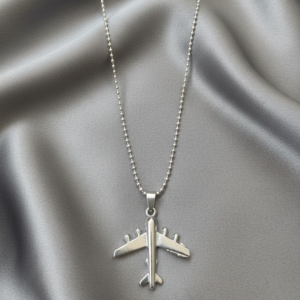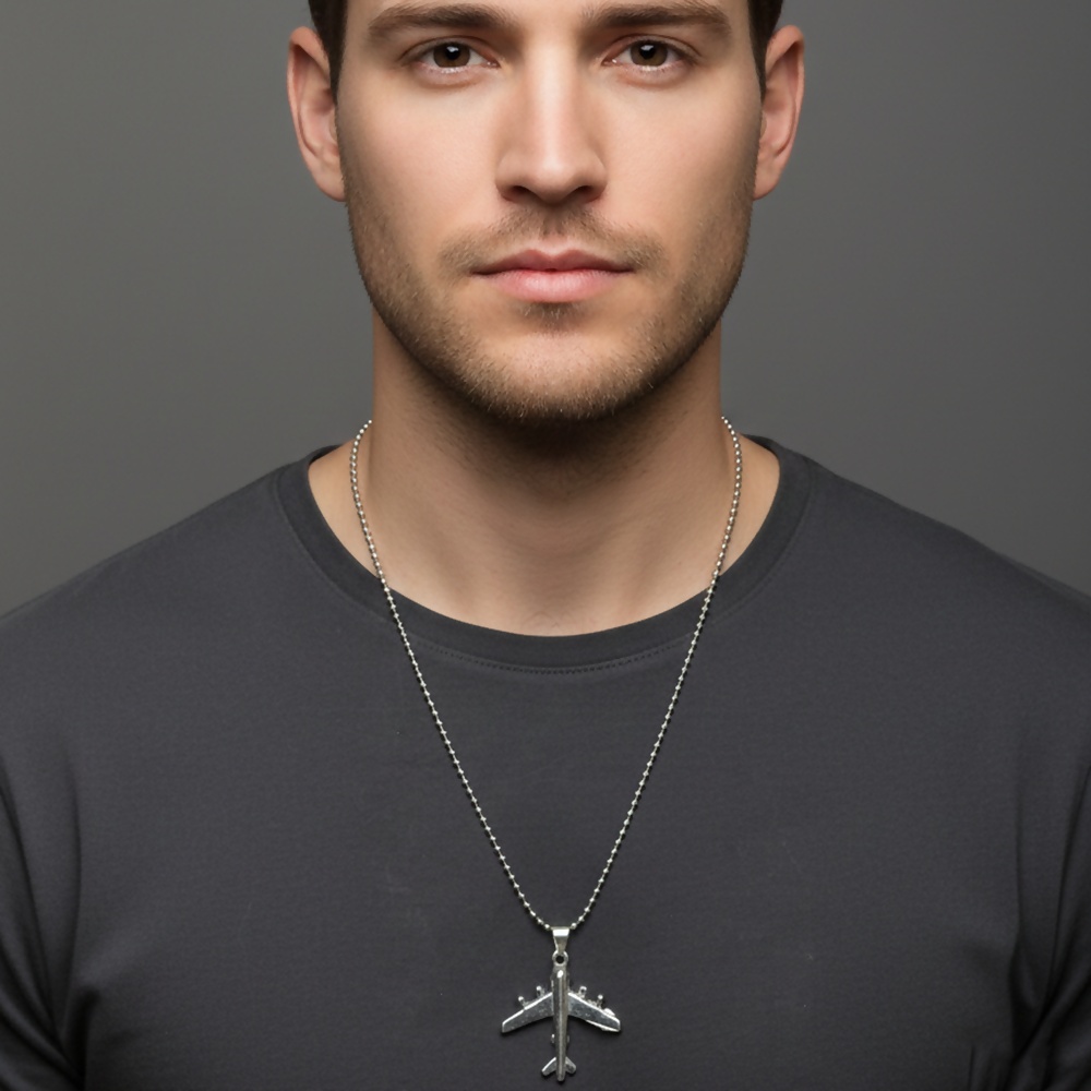 This stylish aeroplane shape pendant necklace is a perfect choice for travel lovers and men who enjoy unique statement accessories. Crafted in a sleek silver-tone finish, the detailed airplane design adds a modern and adventurous touch to your look.