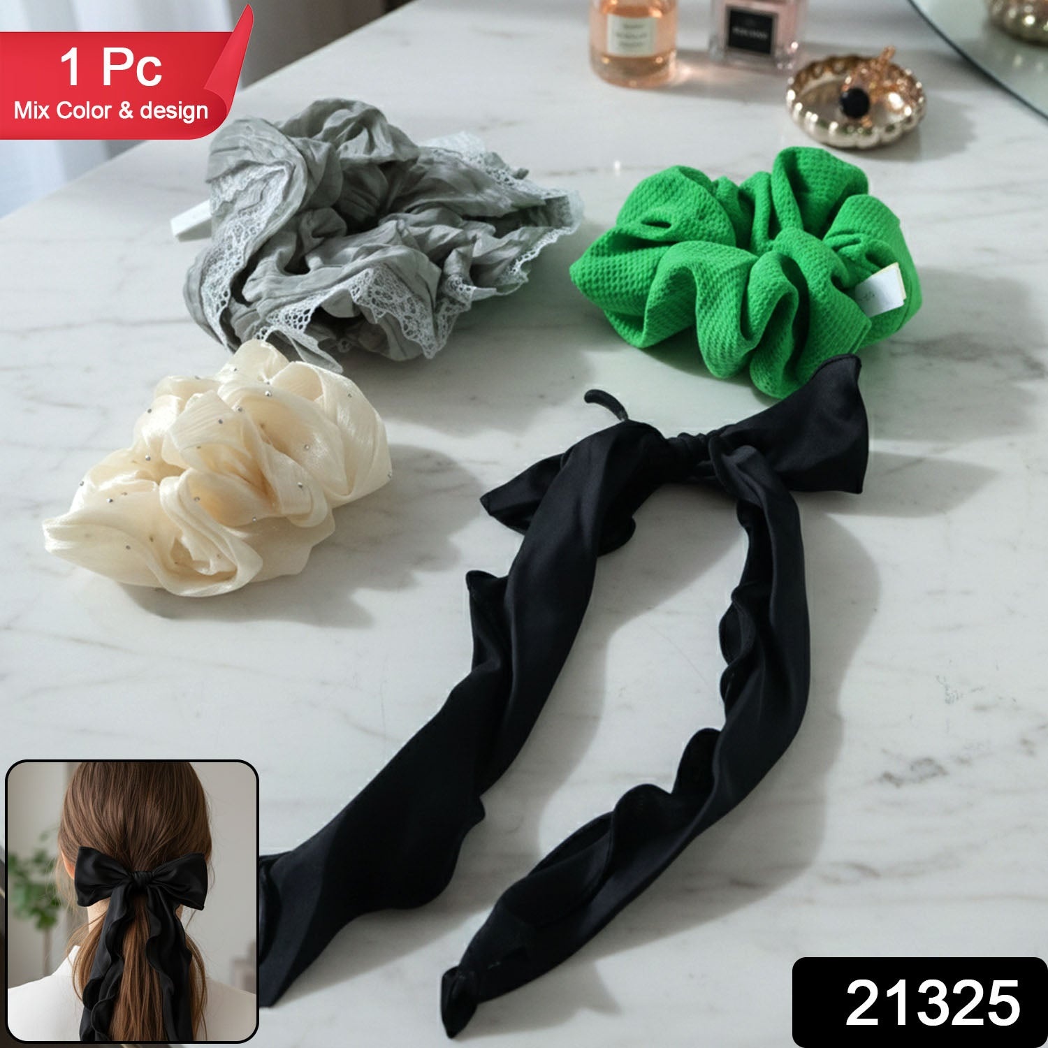 Stylish Fabric Hair Scrunchie with Bow Tie Design for Women & Girls – Soft Stretchable Hair Accessory for Ponytail, Bun Styling & Elegant Daily Wear (Mix Color & Design)