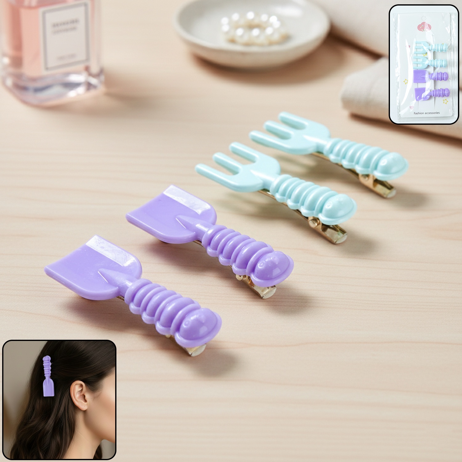 Cute Mini Tool-Shape Decorative Hair Clips for Girls and Women – Stylish Fork & Spade Design Snap Hair Clips for Daily Wear, Party Styling, Casual Outfits and Fashion Hair Accessories (Pack of 4 Pieces)