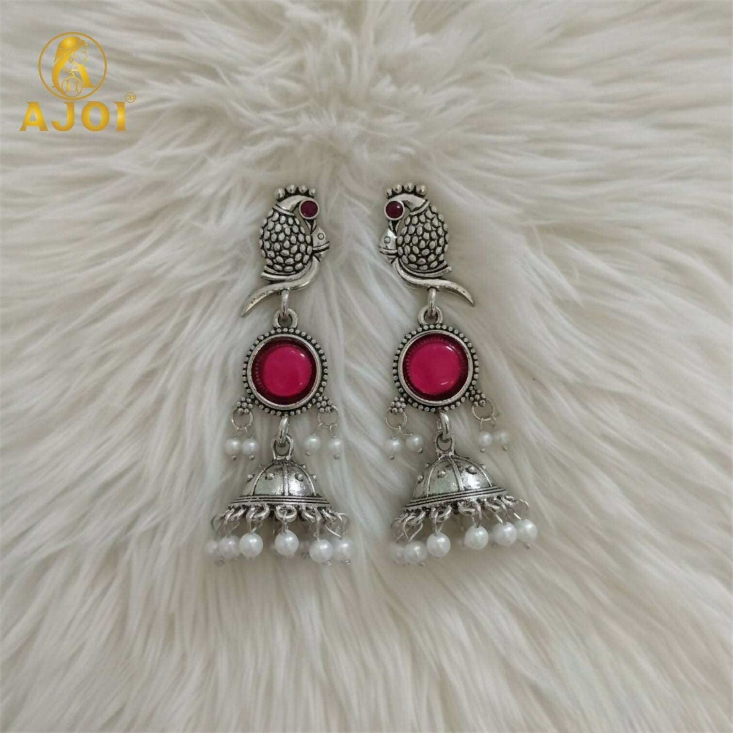 Antique Silver Peacock Jhumka Earrings with Pink Stone & Pearl Drops – Traditional Ethnic Dangle Earrings