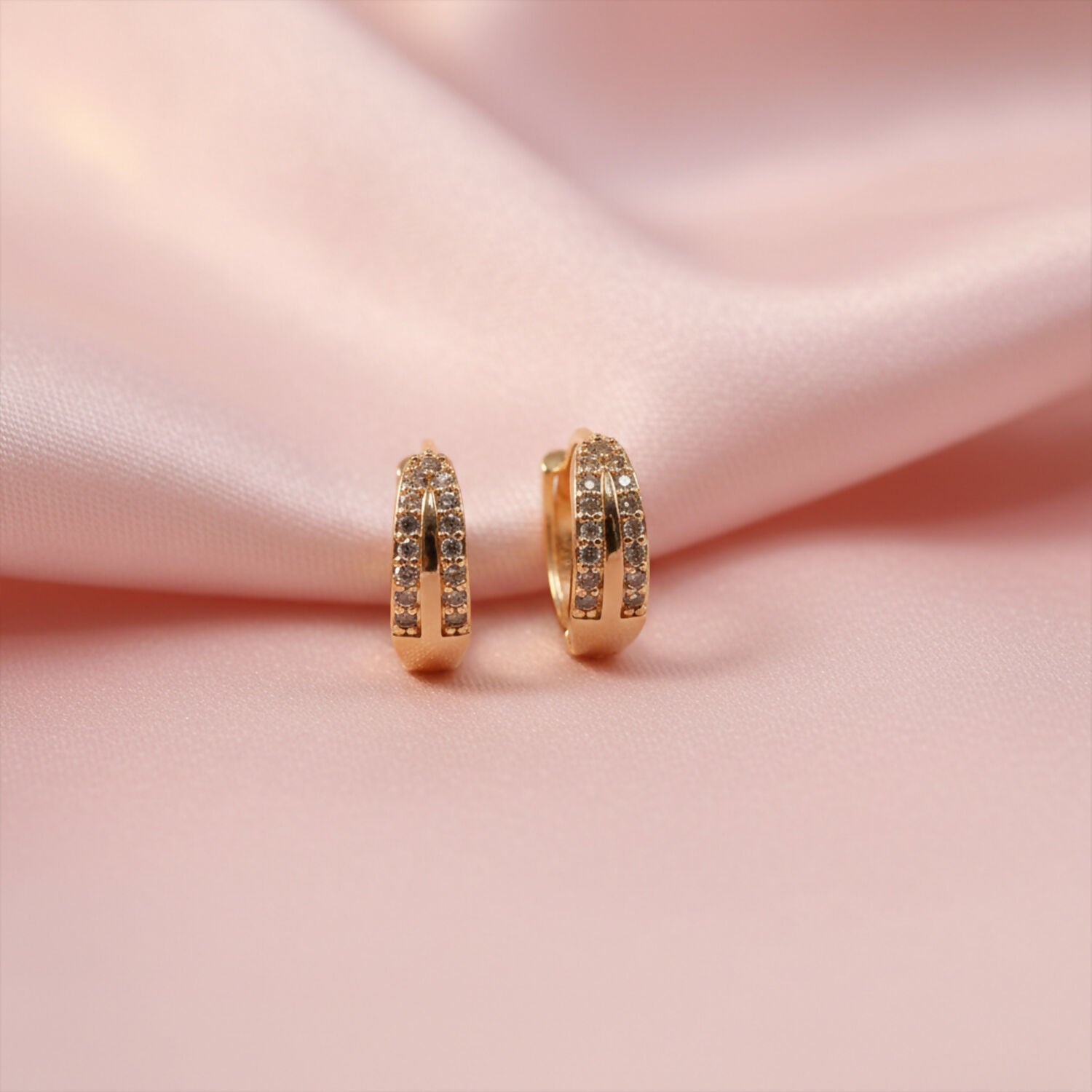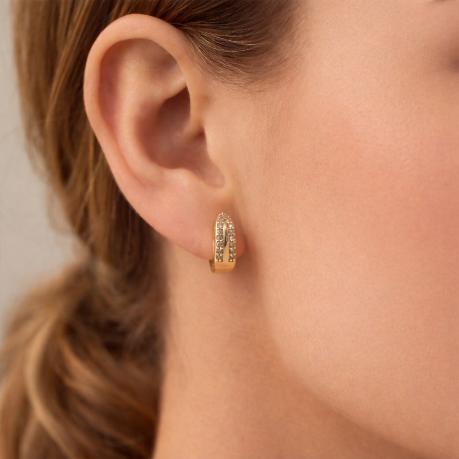 These elegant hoop earrings feature a clean gold-tone finish with neatly set sparkling stones that give a refined and graceful look. The compact hoop style sits comfortably on the ears, making them suitable for everyday wear as well as special occasions. The balanced design adds shine without looking heavy, so it pairs easily with both traditional and western outfits. A versatile accessory that enhances your look with subtle glamour and timeless appeal.