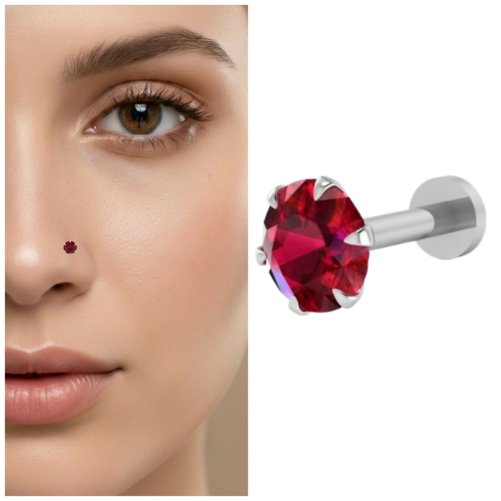 Add a touch of vibrant elegance to your look with this stunning Silver Plated Red Ruby Nose Pin. Designed for the modern woman who appreciates classic beauty, this piece features a brilliant, multi-faceted red crystal that captures and reflects light from every angle.