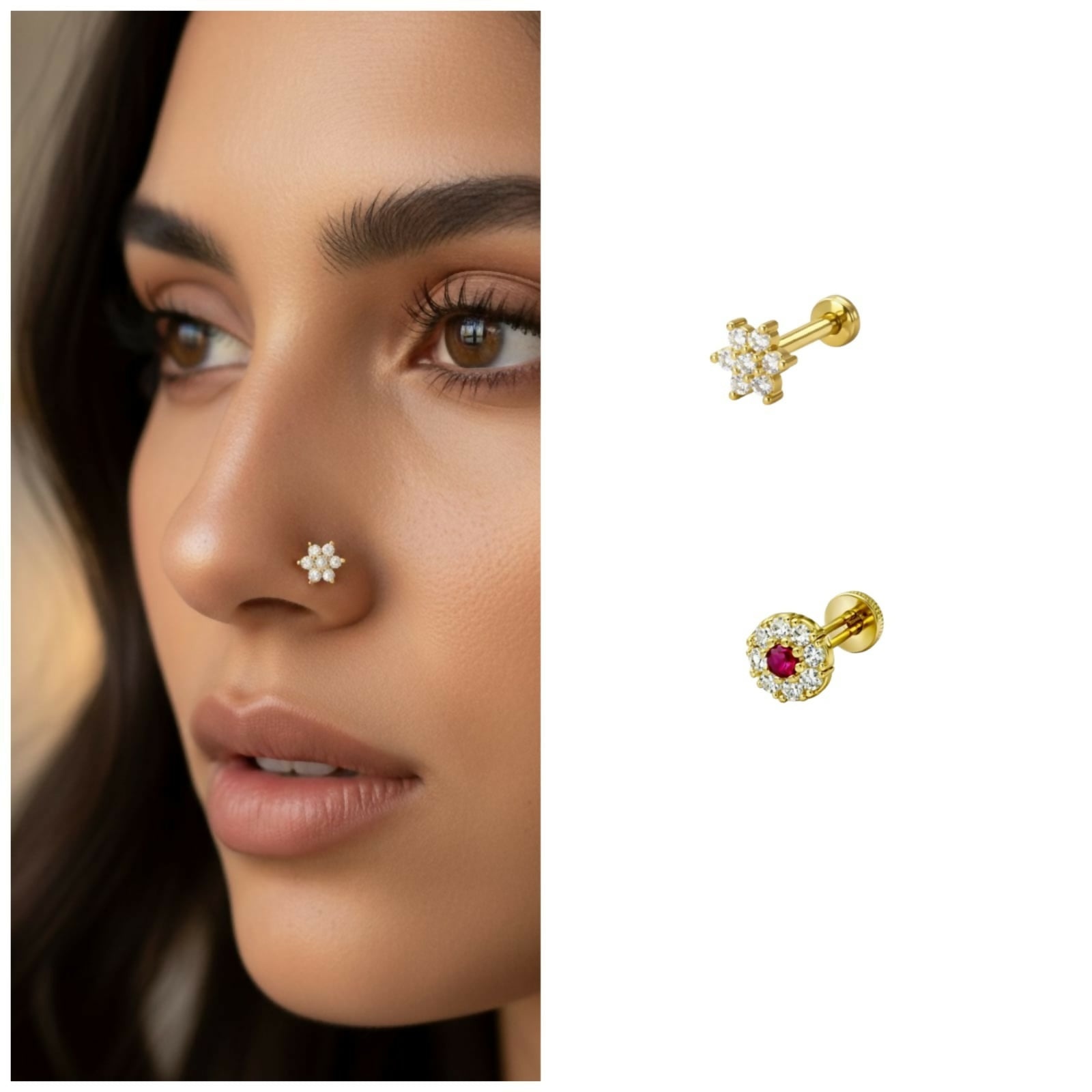 Elevate your everyday look with our exquisite Floral Nose Stud Set. Crafted for both comfort and style, this set features two stunning designs: a classic shimmering diamond-white crystal flower and a sophisticated ruby-red center floral halo. Both pieces are finished in premium gold plating, offering a luxurious tarnish-resistant glow that complements any skin tone.