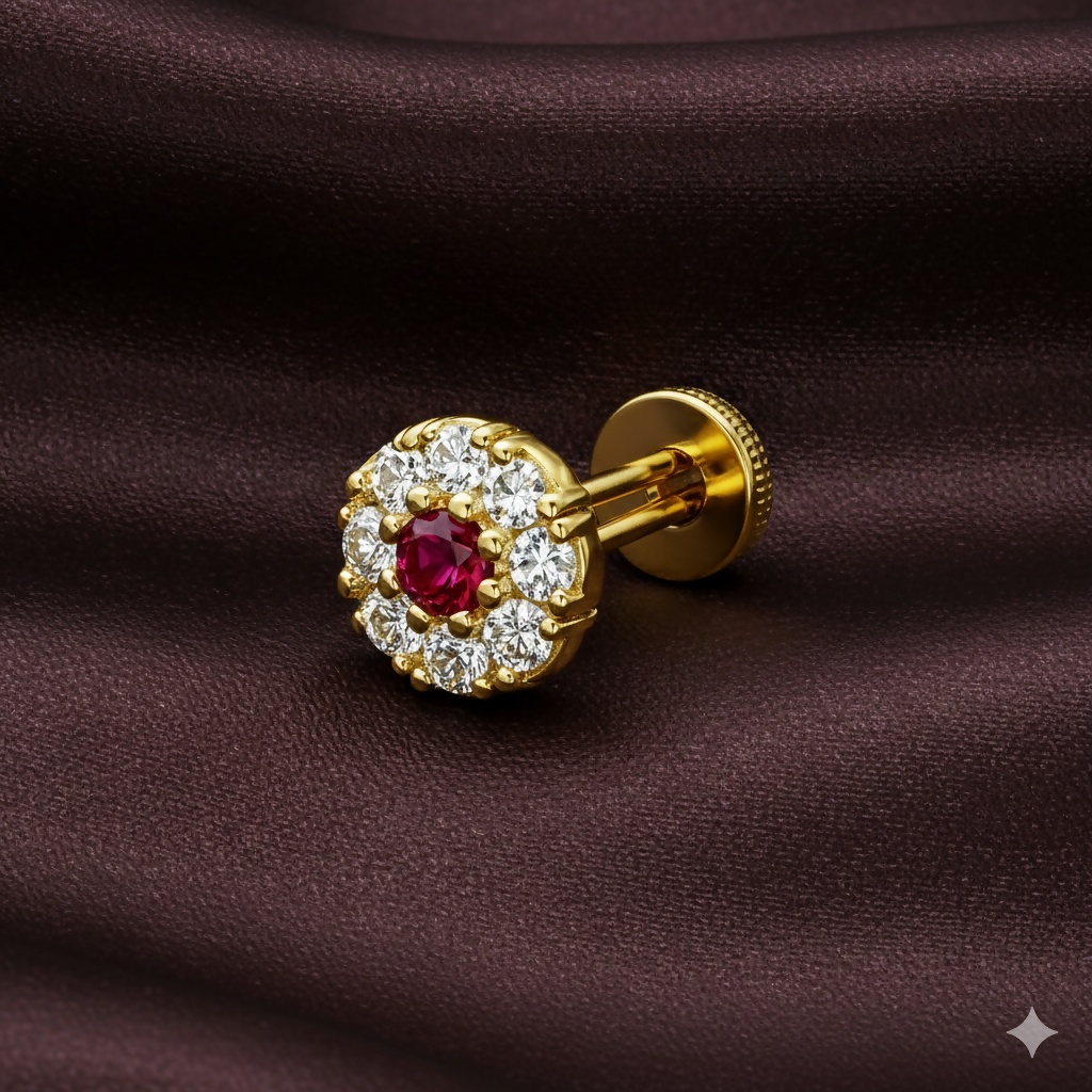 Elevate your everyday style with this exquisite Floral Halo Nose Pin. Designed for those who appreciate timeless elegance, this piece features a vibrant, lab-grown red ruby center, encircled by a shimmering halo of brilliant white stones.