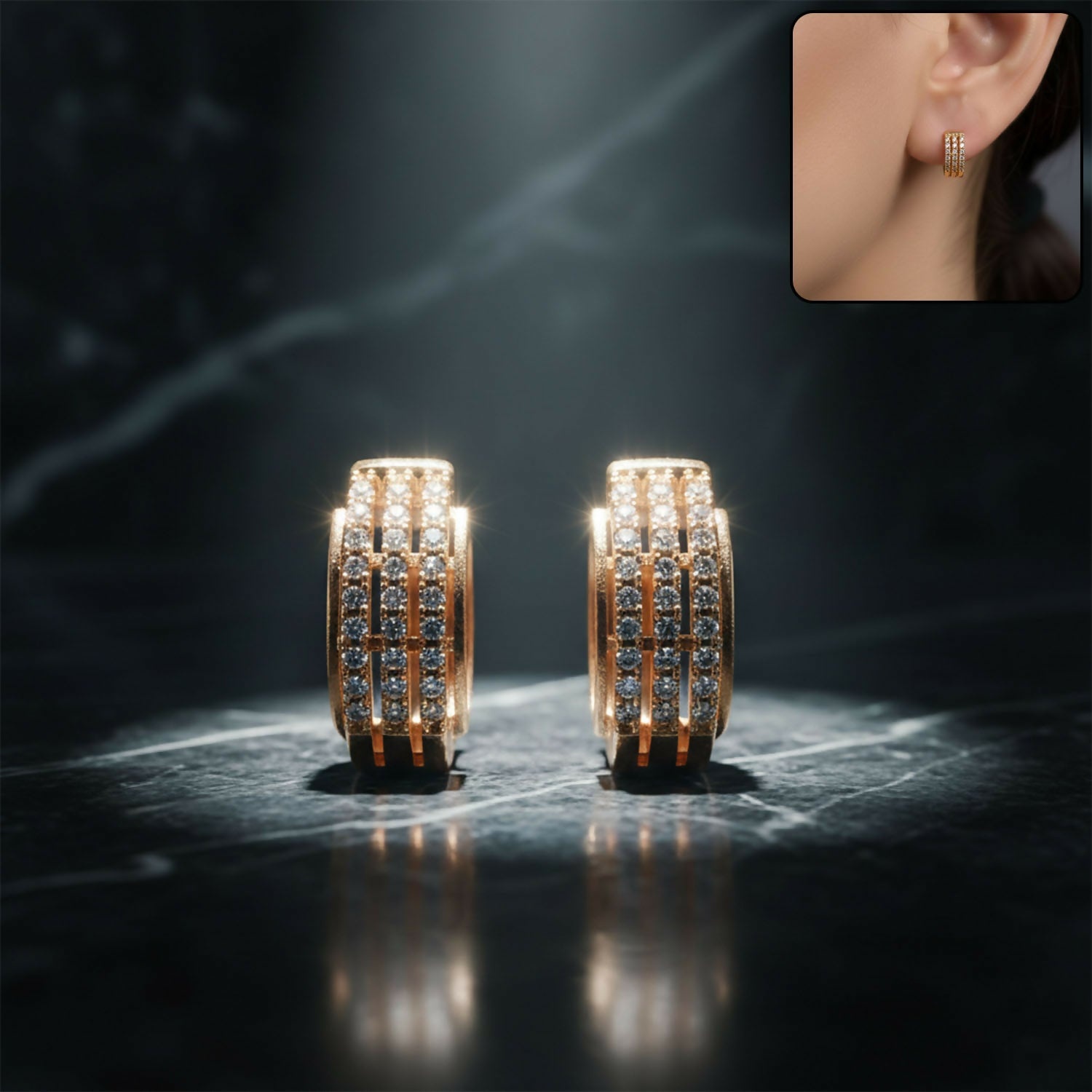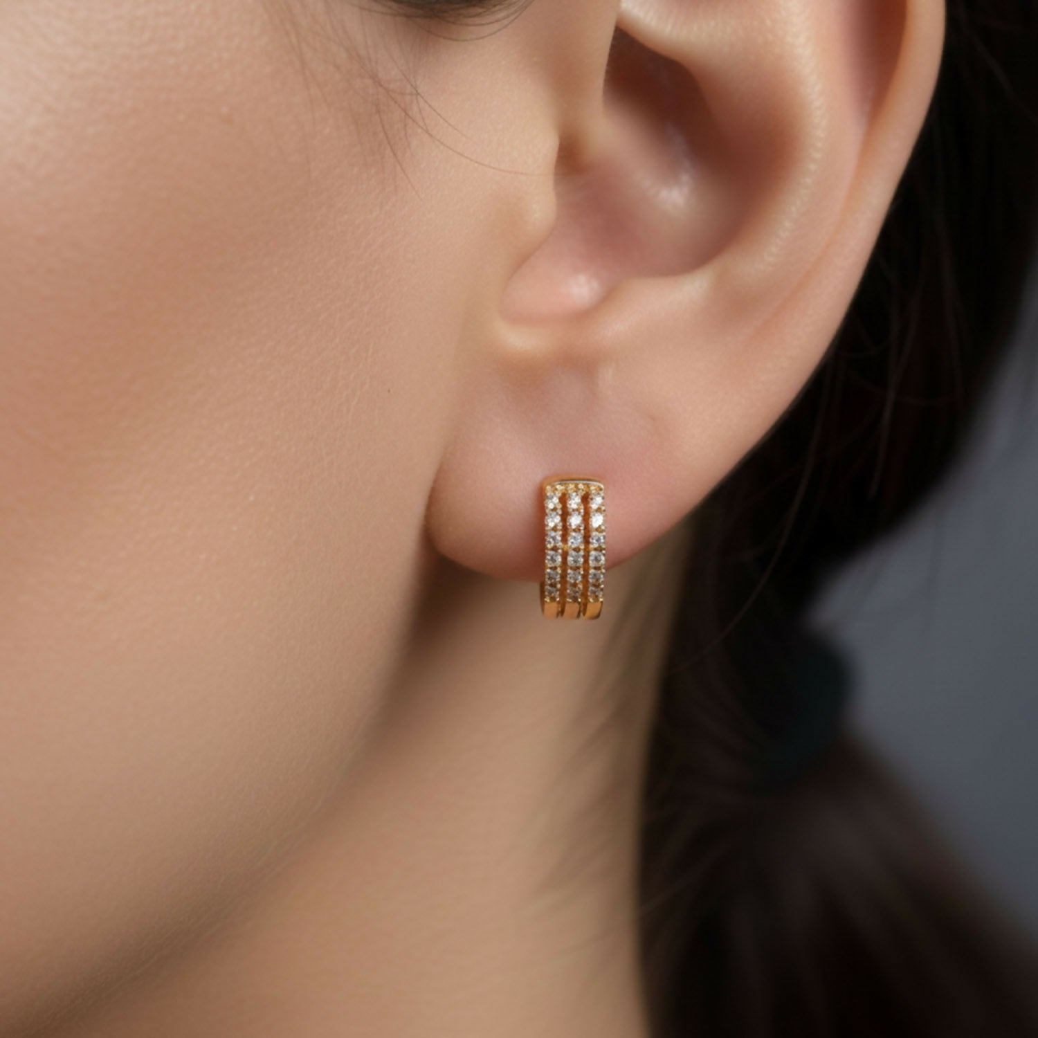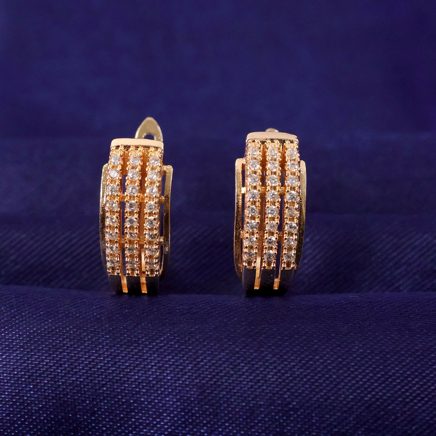 Enhance your style with these elegant gold finish crystal hoop earrings designed for a refined and modern look. Featuring multiple rows of sparkling stones, these hoops add just the right amount of shine without looking heavy. Their sleek design makes them suitable for daily wear, office outfits, and special occasions alike. The secure clasp ensures comfortable wear throughout the day. A versatile jewellery piece that effortlessly complements both western and ethnic looks.