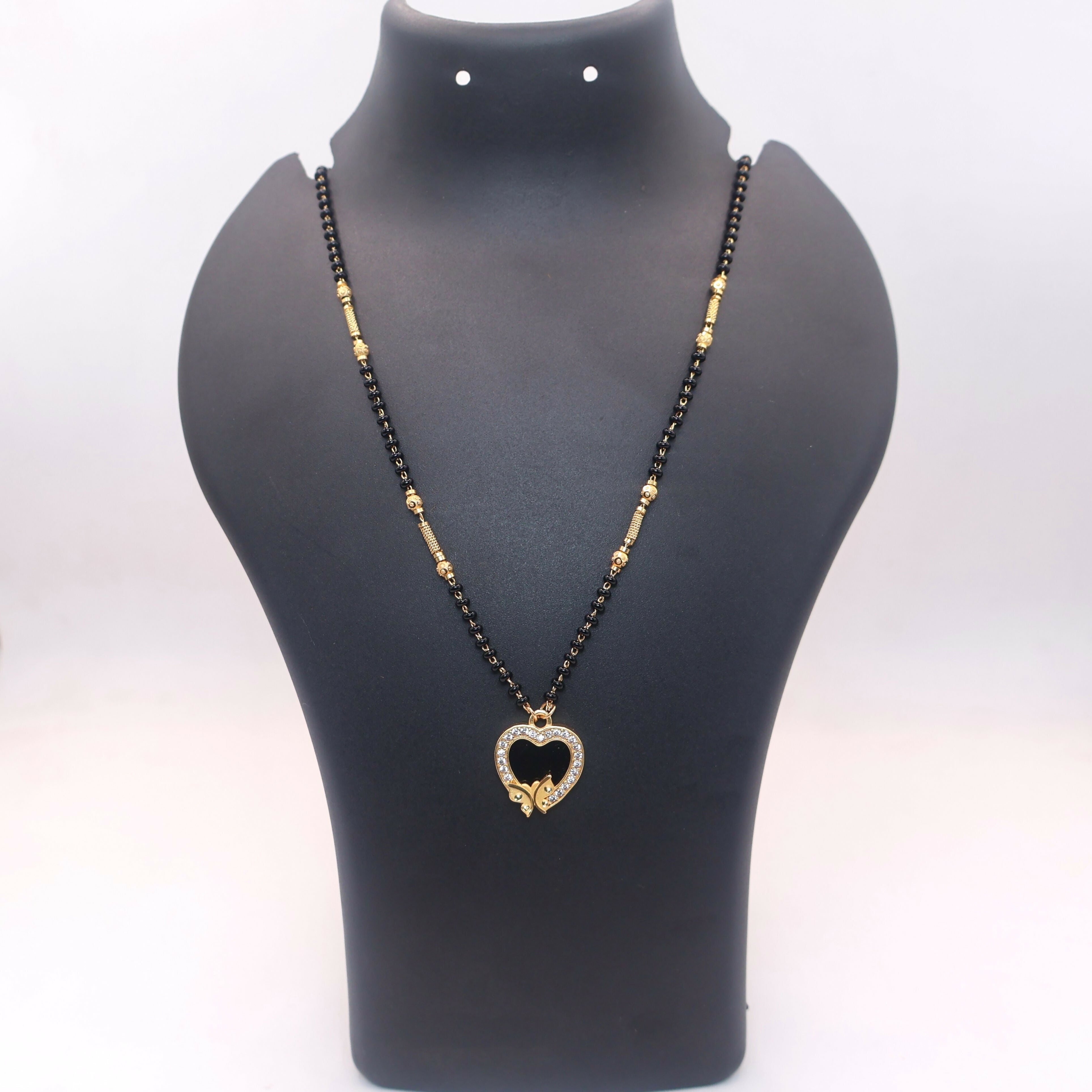 This striking Mangalsutra features a sophisticated heart-shaped pendant finished with sleek black enamel and adorned with a delicate golden butterfly motif. Framed by a halo of shimmering American Diamonds (CZ), this piece is a bold statement of love and contemporary grace.