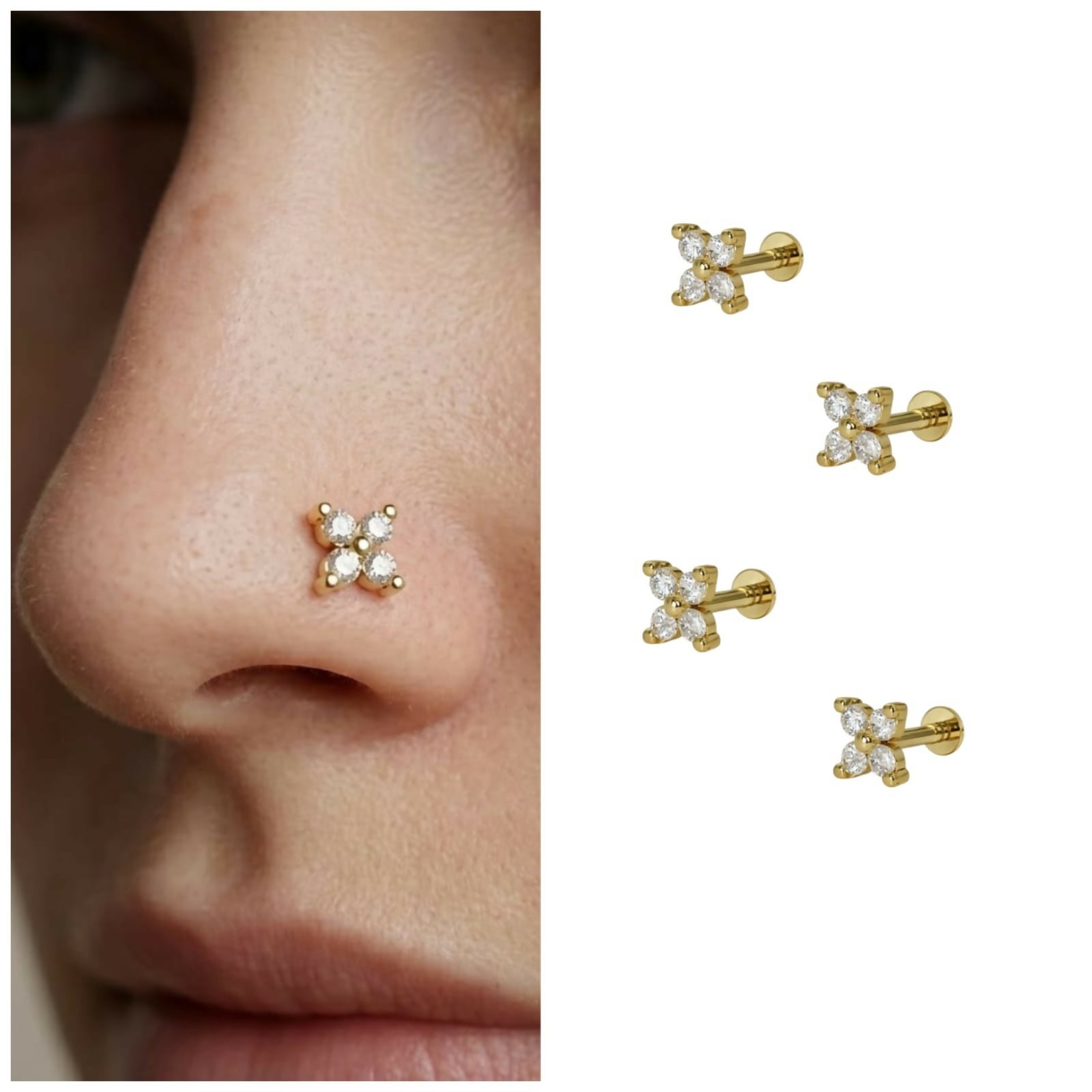 Gold plated Clover Flat Back Labret AD nosepin stud Combo Pack of 4