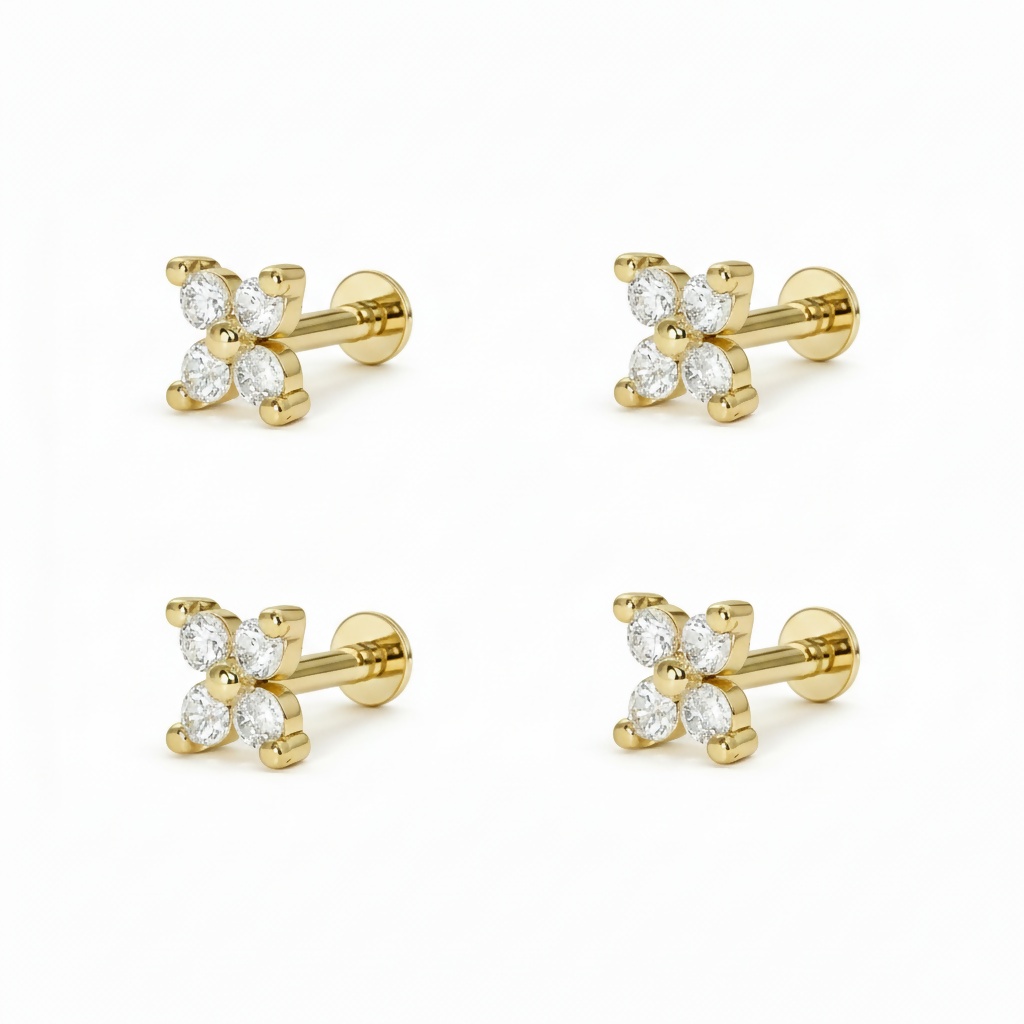 Crafted for both comfort and brilliance, this stunning Gold-plated labret features a delicate four-petal clover design. Each petal is set with a shimmering, high-grade cubic zirconia (or diamond) that catches the light from every angle, offering a sophisticated sparkle that never goes out of style.