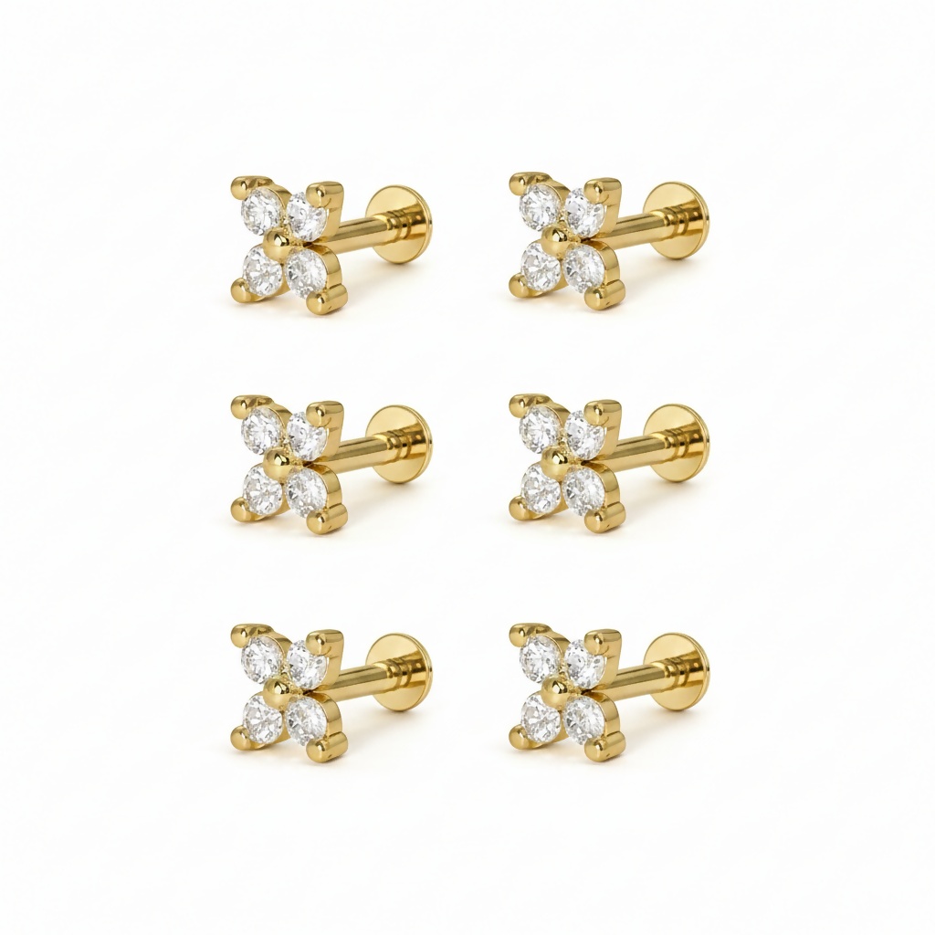 Elevate your jewelry collection with this stunning Four-Petal Clover Labret Stud. Crafted for both elegance and comfort, this piece features four brilliant-cut sparkling crystals set in a classic yellow gold-plated finish. The unique "X" or floral silhouette offers a modern twist on a timeless design, making it a versatile addition to any look.