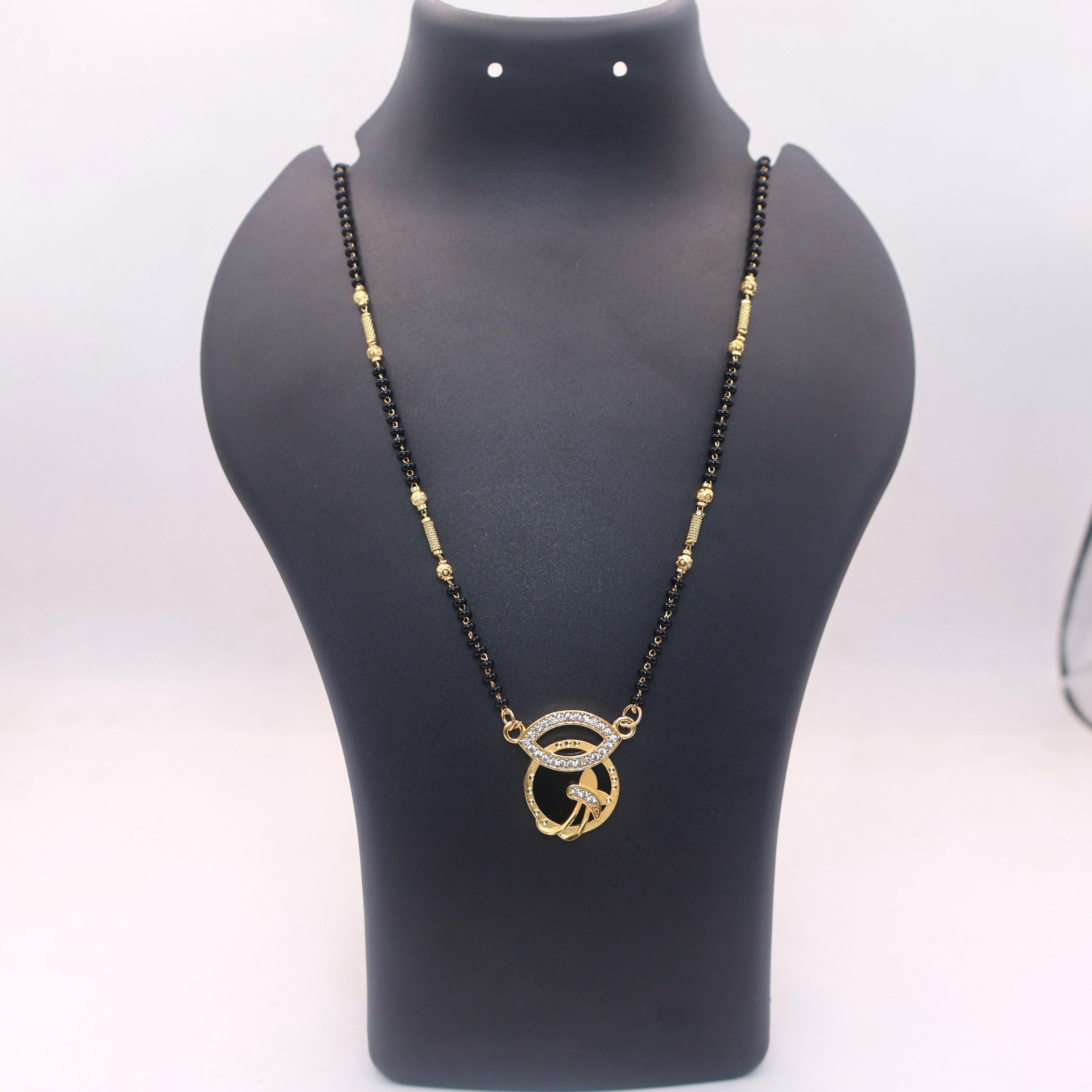 Elevate your everyday elegance with this stunning contemporary Mangalsutra. Blending traditional significance with modern aesthetics, this piece is designed for the woman who appreciates timeless style. Featuring a delicate chain of jet-black beads interspersed with shimmering gold-toned accents, it leads to a uniquely crafted circular pendant.