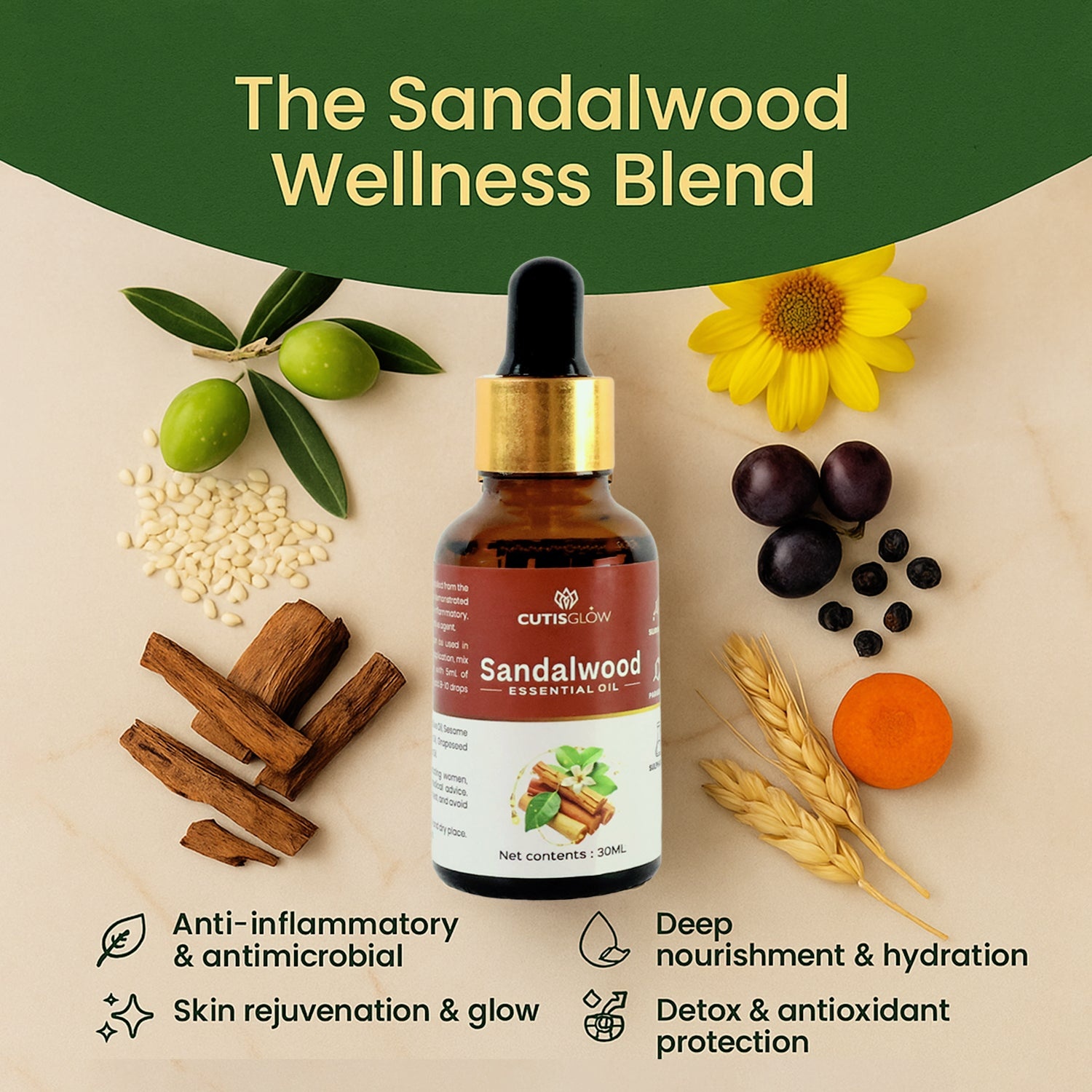 Experience the soothing essence of nature with CutisGlow Sandalwood Essential Oil, carefully crafted to deliver purity and natural wellness in every drop. Known for its calming aroma and therapeutic benefits, sandalwood oil is a timeless choice for skincare, haircare, and aromatherapy.