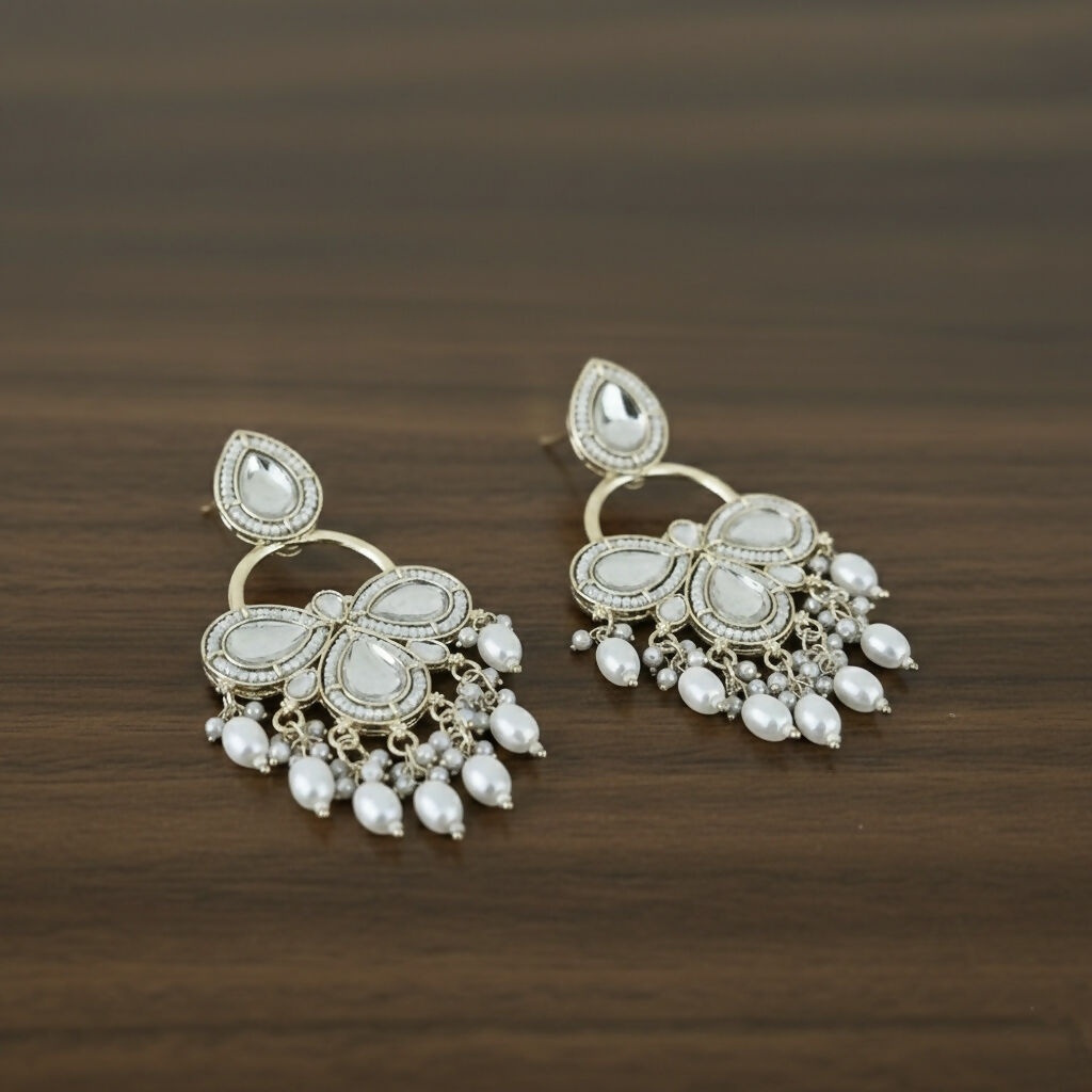 These earrings are an elegant example of Chandbali-inspired Kundan jewelry,The earrings feature high-quality clear glass stones (Kundan) set in a tiered arrangement. The top stud and the main body both showcase teardrop-cut stones for a cohesive look. These pair beautifully with pastel-colored Lehengas, white Chikankari suits, or even a dark velvet saree to provide a striking contrast.