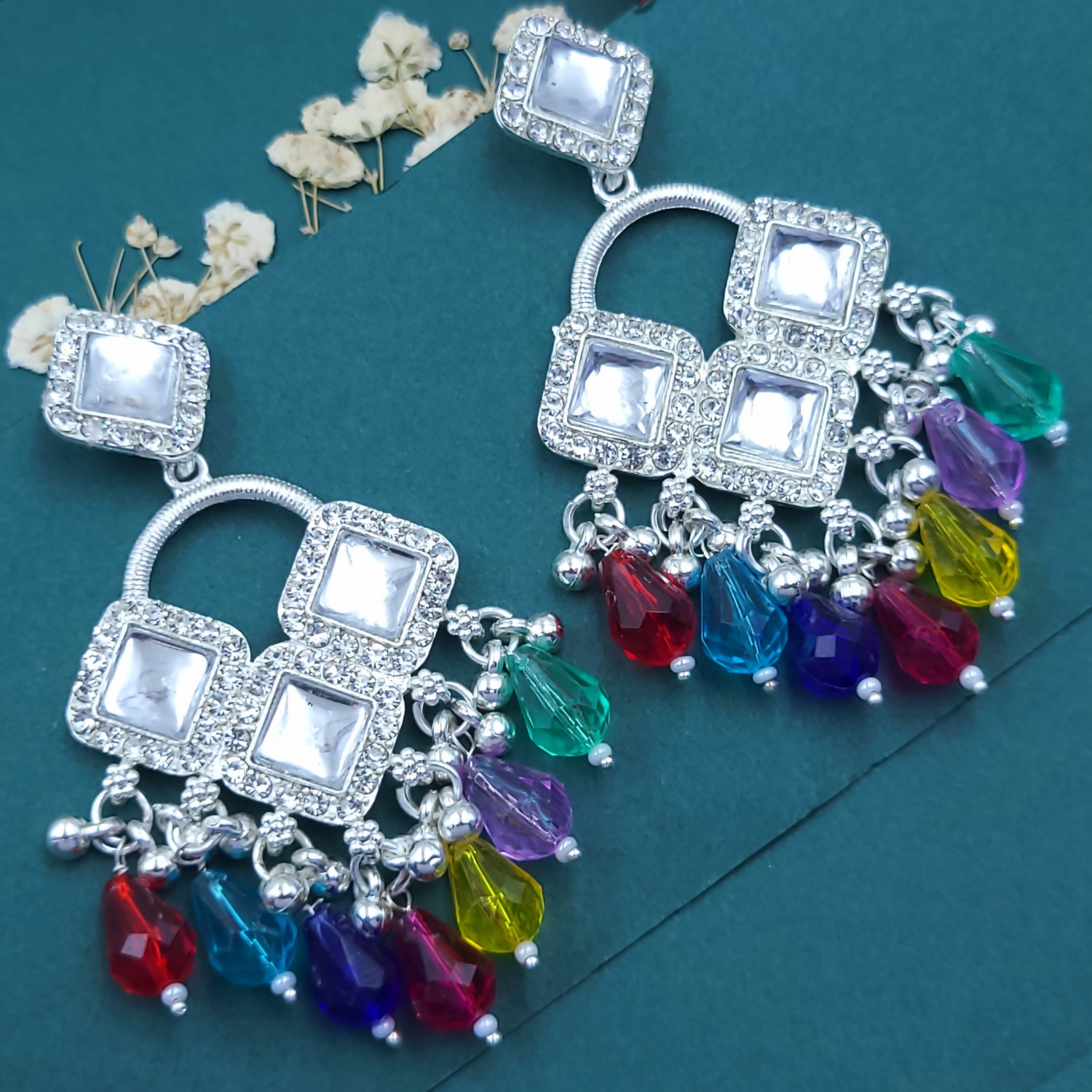 Gracefully suspended from the base are faceted teardrop beads, each finished with delicate silver detailing that enhances their brilliance and sparkle. The combination of clear crystals and vibrant drops creates a striking contrast, making these earrings perfect for festive occasions, weddings, parties, and evening wear.