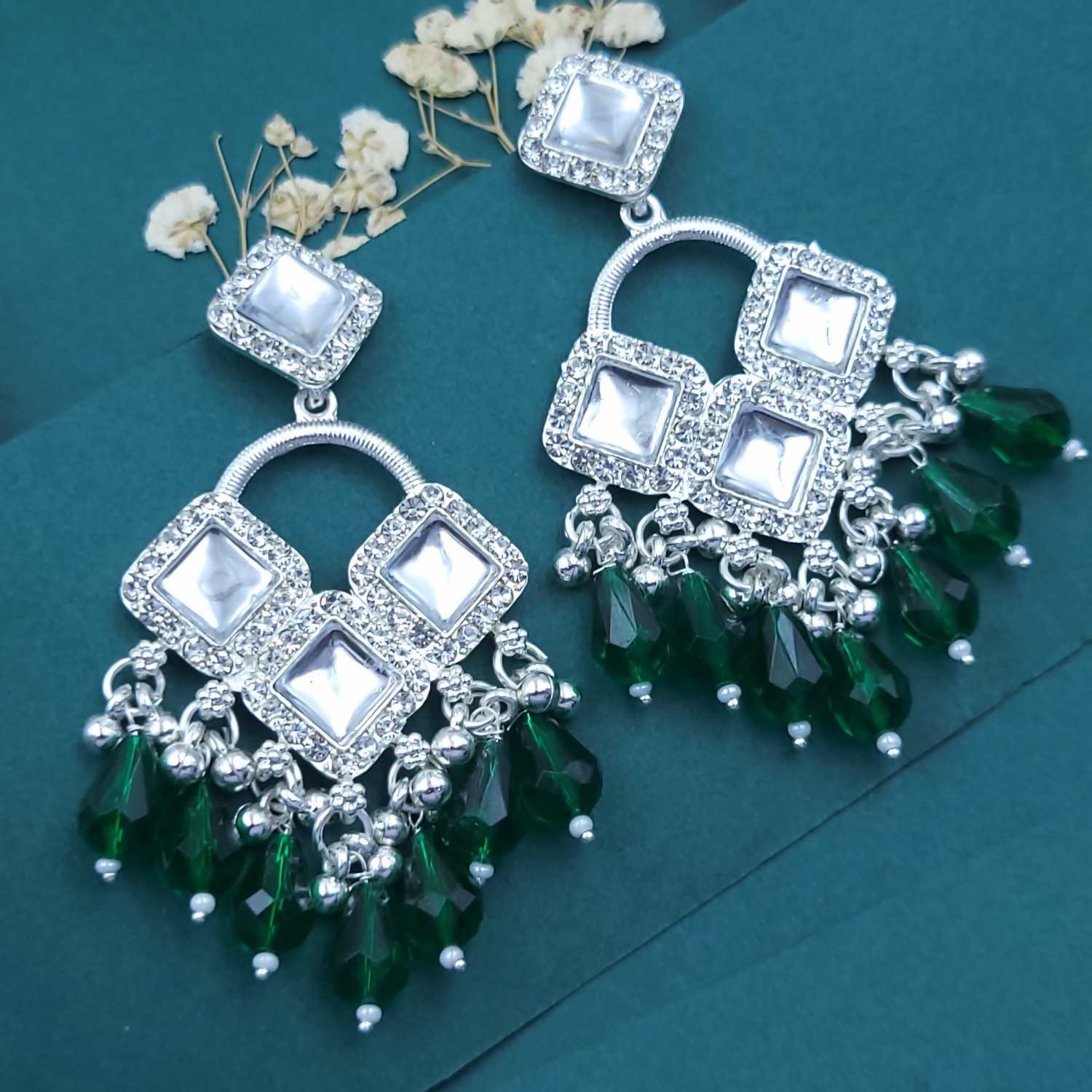 Elegant Silver Plated Chandelier Earrings Featuring Square Crystals and Green Teardrop Beads