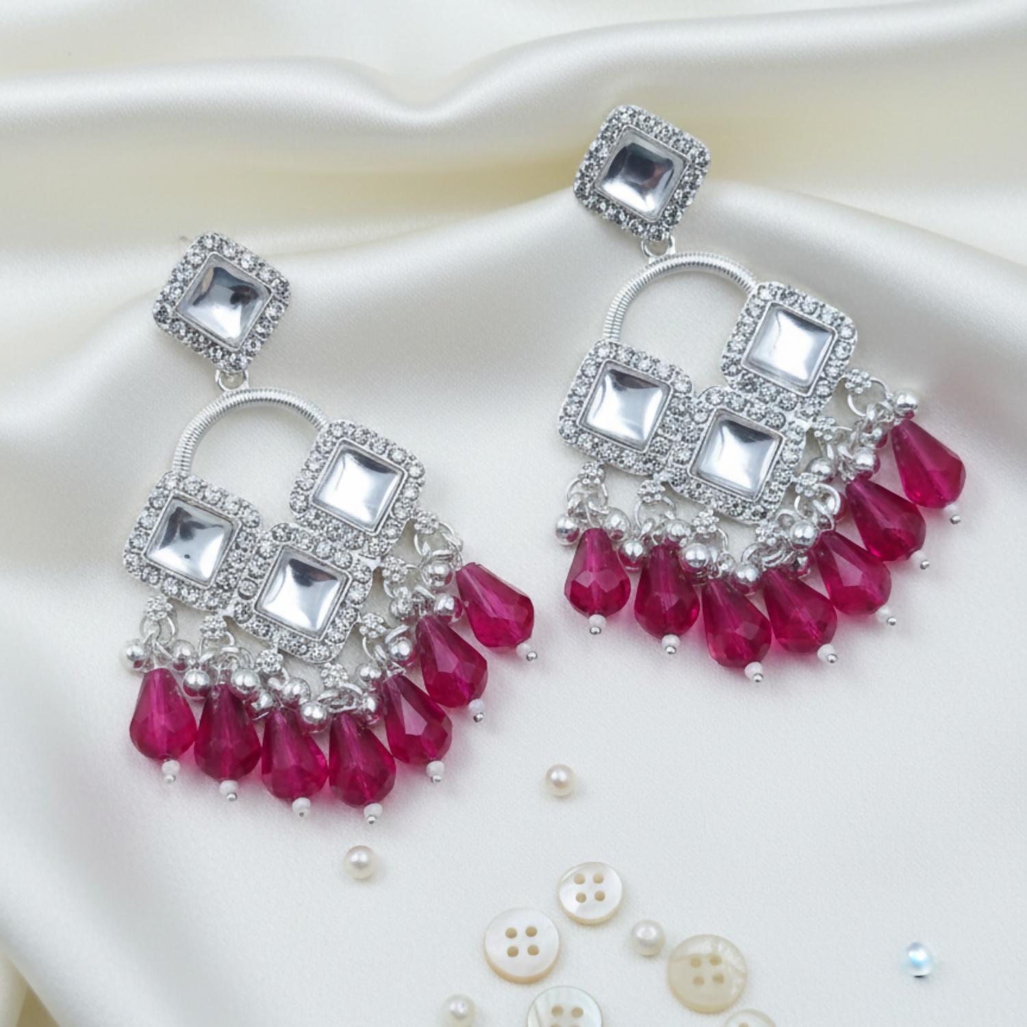 Elegant Silver Plated Chandelier Earrings Featuring Square Crystals and Dark Pink Teardrop Beads
