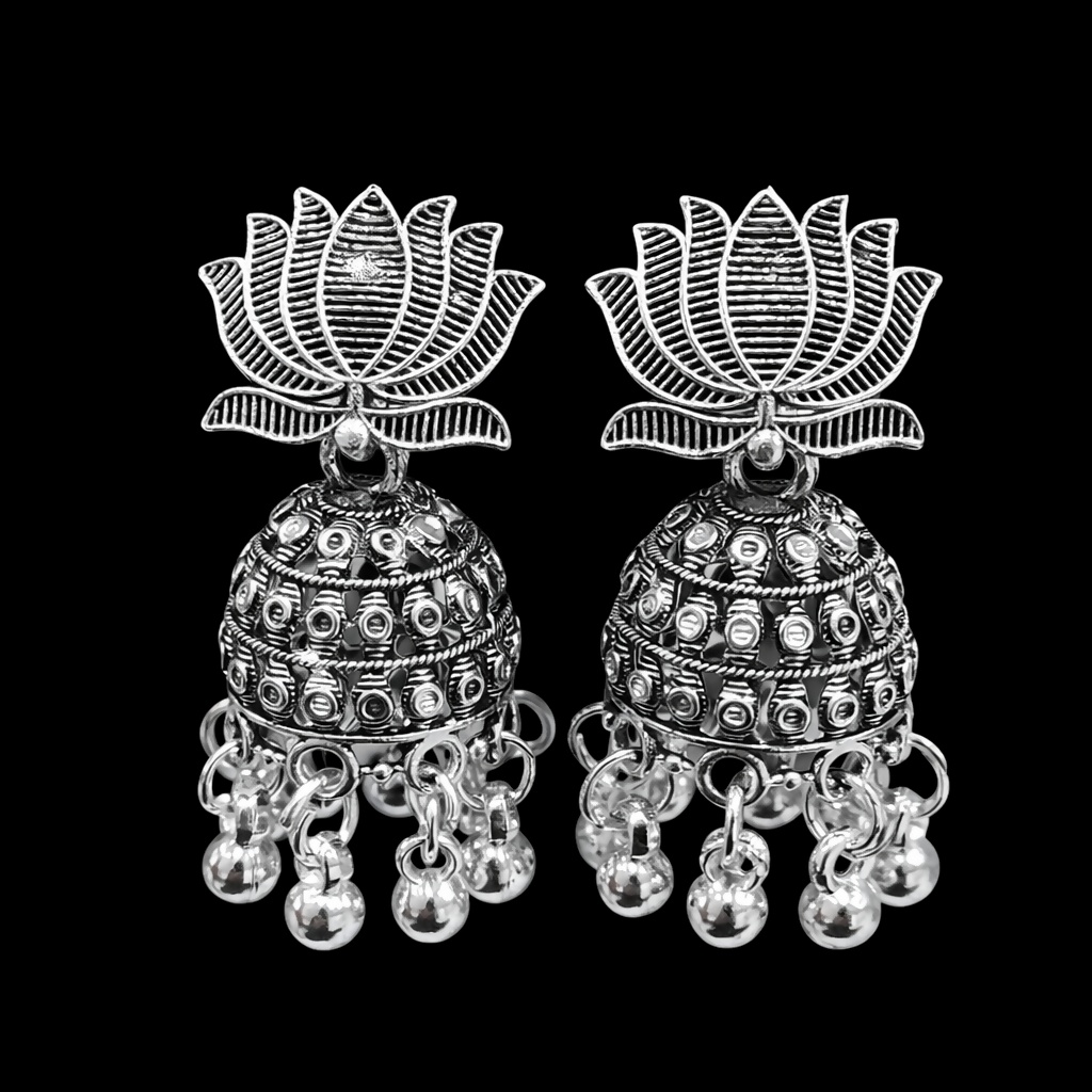 This stunning pair of oxidised silver lotus jhumka earrings features an elegant lotus motif at the top with finely detailed traditional jhumka work below. Crafted with a rich oxidised finish, the intricate patterns and dangling ghungroo beads create a graceful ethnic look. Lightweight and comfortable, these earrings are ideal for festivals, weddings, pooja functions, and everyday traditional wear. Their timeless design pairs beautifully with sarees, kurtis, lehengas, and Indo-western outfits, making them a perfect addition to any jewellery collection.