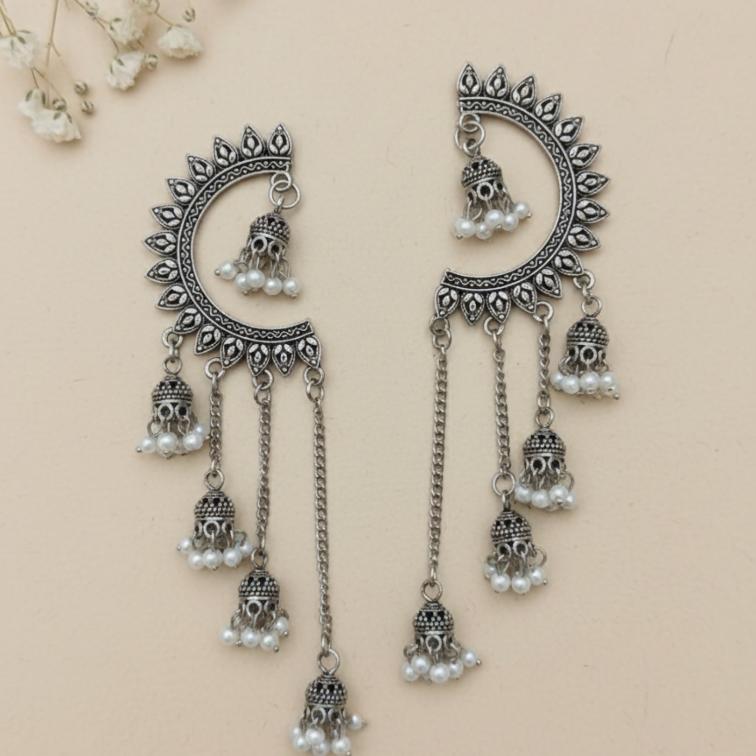 Beautiful oxidized silver crescent-shaped Chandbali earrings featuring intricate traditional detailing. Adorned with delicate pearl jhumka danglers and fine chain drops, these earrings create graceful movement and a regal look. Perfect for weddings, festive occasions, and ethnic wear, they add timeless charm to sarees, lehengas, and anarkalis. Lightweight yet statement-making, ideal for both bridal and traditional styling.
