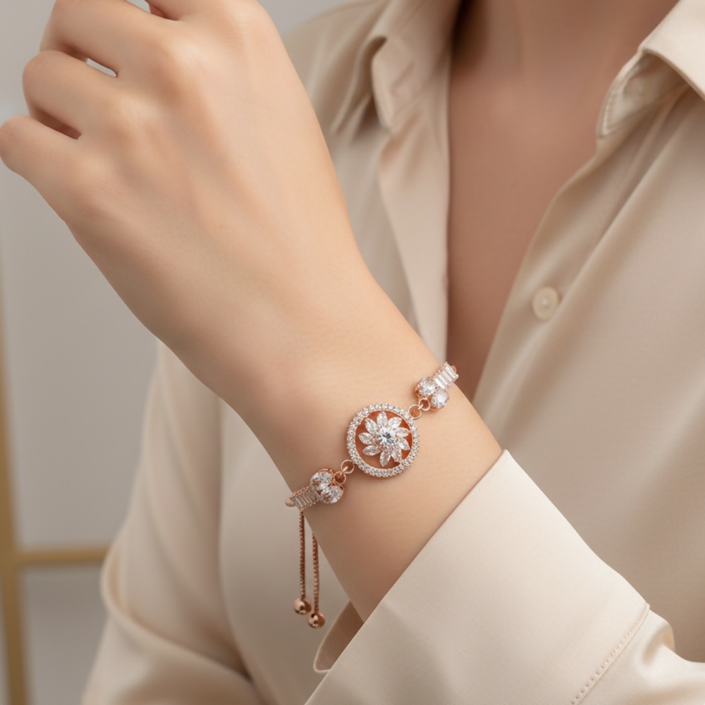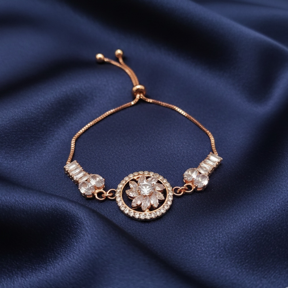 Enhance your elegance with this beautifully crafted AD Floral Design Bracelet. Adorned with sparkling American Diamond stones in a delicate floral pattern, this bracelet adds a graceful charm to any outfit.