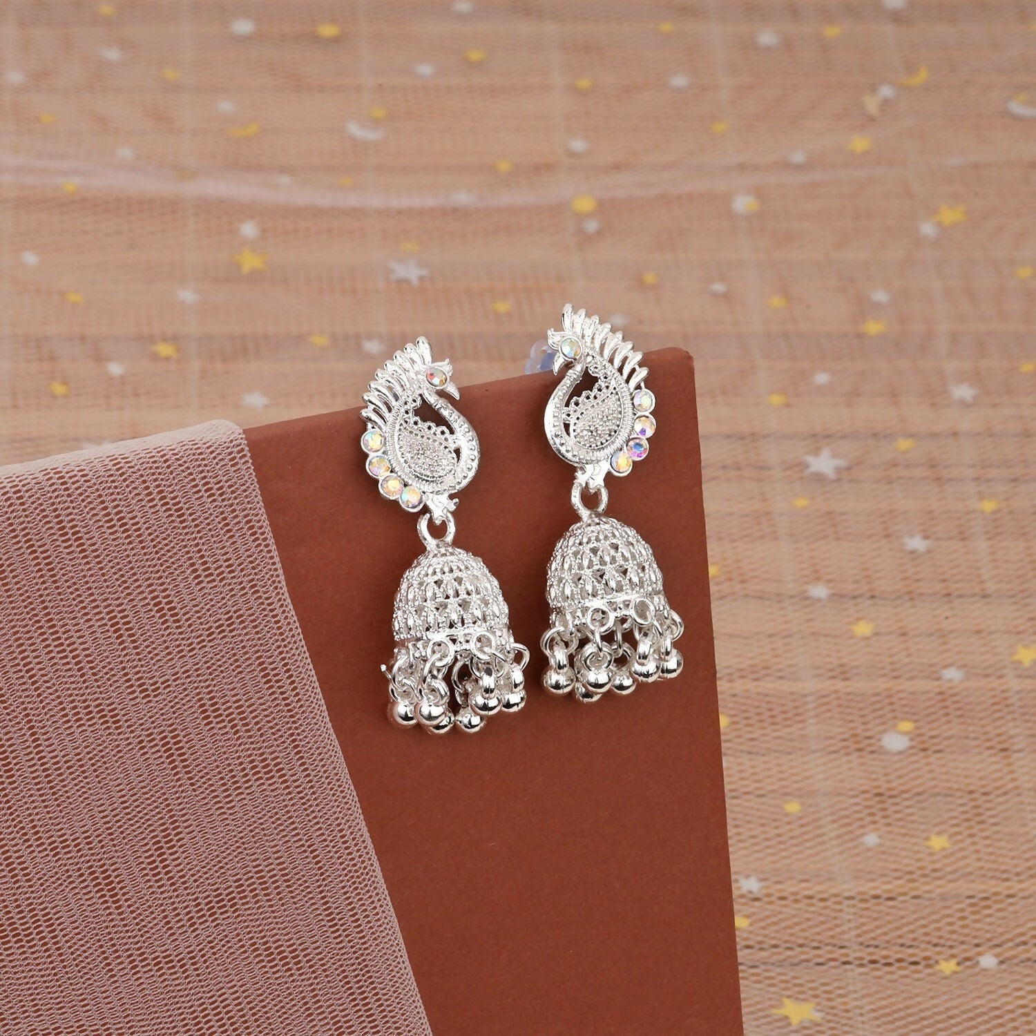 Elegant silver finish jhumka earrings designed with a graceful peacock motif and sparkling stone detailing. The finely crafted dome-shaped jhumka with ghungroo hanging adds a classy traditional touch. Lightweight, comfortable and perfect for festive as well as ethnic wear.