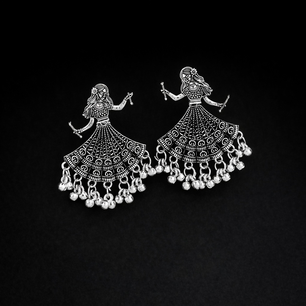 Celebrate traditional artistry with these exquisite oxidised silver dancing doll earrings. Featuring an intricately detailed dancing-figure motif, each earring showcases fine craftsmanship with a flared skirt design and delicate ghungroo danglers that add graceful movement and charm.