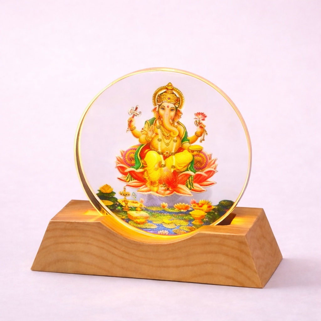 Lord Ganesha Acrylic LED Lamp with Wooden Base | Devotional Night Light