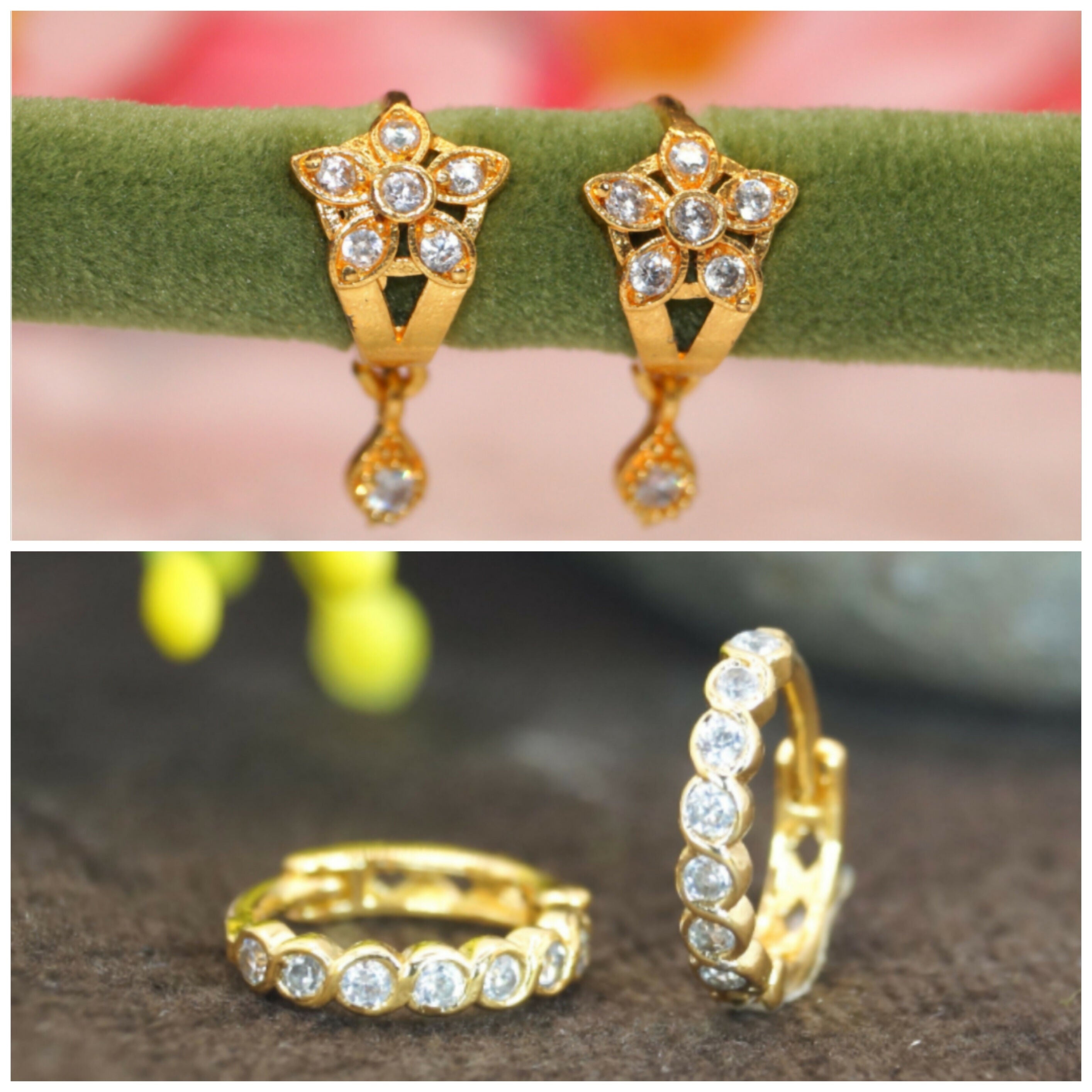 Gold Plated Flower AD Drop Huggie Earrings kan ki bali for women and girls combo pack of 2