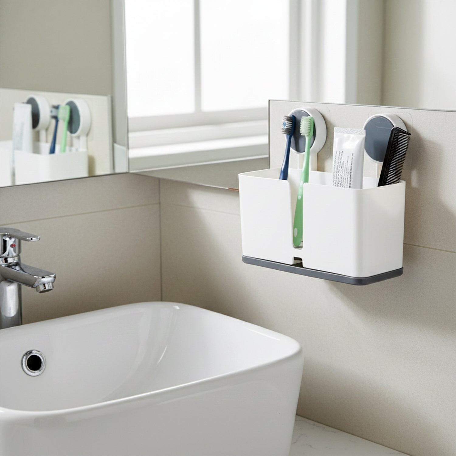 This wall mounted toothbrush holder is designed to keep daily oral care essentials neatly organized while saving countertop space. The three-compartment layout allows separate storage for toothbrushes, toothpaste, and small bathroom accessories, helping maintain hygiene and order. Its wall mount design keeps items elevated, reducing contact with wet surfaces and promoting cleaner bathroom conditions. Easy to install using adhesive mounting, this holder is suitable for bathrooms of all sizes. Ideal for everyday use, it provides a practical and clutter-free solution for organizing oral care products in a clean and accessible manner.