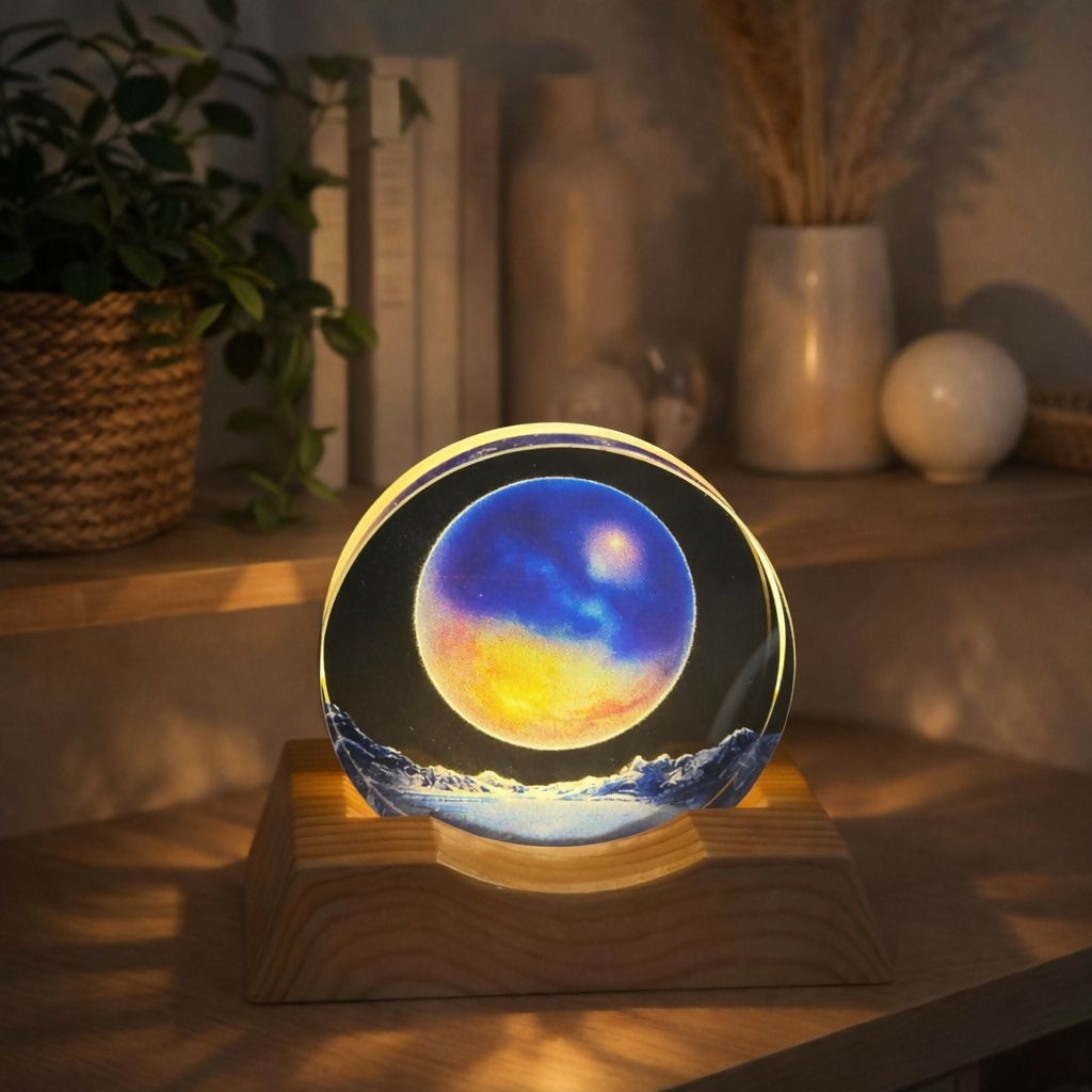Galaxy Moon 3D Acrylic LED Night Lamp with Wooden Base for Home Decor
