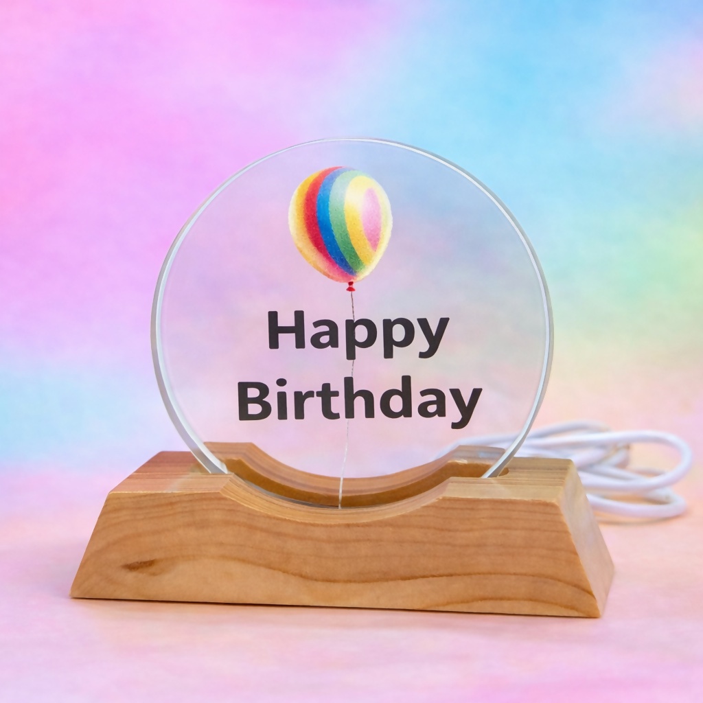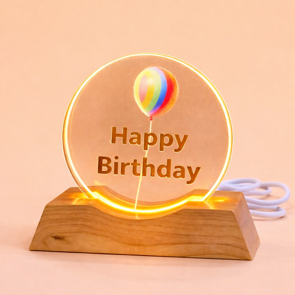 Celebrate special moments with this elegant Happy Birthday acrylic LED plaque. Crafted with a clear round acrylic design and paired with a natural wooden base, this decorative lamp creates a soft ambient glow that enhances any space. The colorful balloon design adds a cheerful touch, making it perfect for birthday celebrations, gifting, and home décor. Ideal for bedrooms, living rooms, desks, and party setups, this lamp is easy to use and makes a thoughtful keepsake gift for all ages.