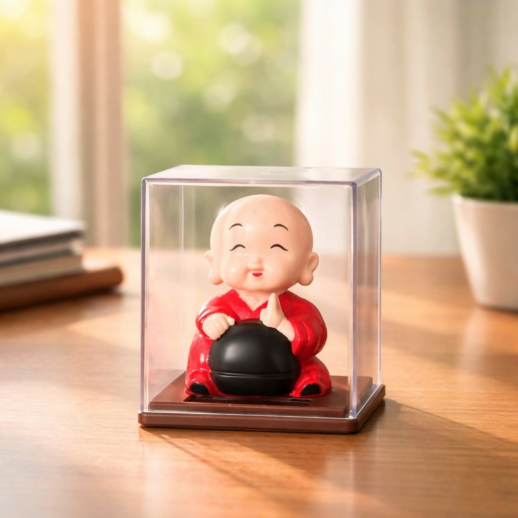 Laughing Buddha Idol in Transparent Display Box for Home & Office Decor (1 PC SOLAR POWERED)