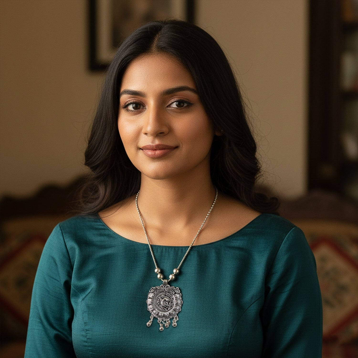 This antique silver-tone oxidized pendant necklace showcases a beautifully detailed floral medallion inspired by traditional ethnic artistry. The intricately engraved round pendant is complemented by a beaded chain that enhances its vintage charm and cultural appeal. Designed to stand out as a statement piece, this necklace pairs effortlessly with ethnic outfits and fusion wear, adding character and elegance to your look. Lightweight and comfortable for extended wear, it is ideal for festive occasions, cultural gatherings, and special events. A timeless imitation jewellery piece that reflects heritage craftsmanship and classic styling.