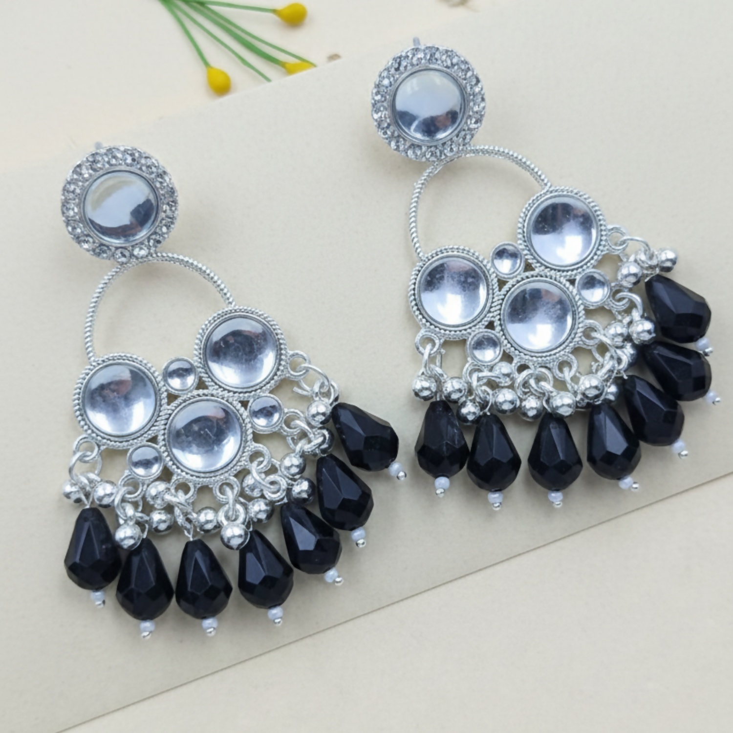 Statement Drops: The base is finished with faceted black teardrop beads and tiny white pearl-like accents, creating a bold "jhumka" inspired silhouette.