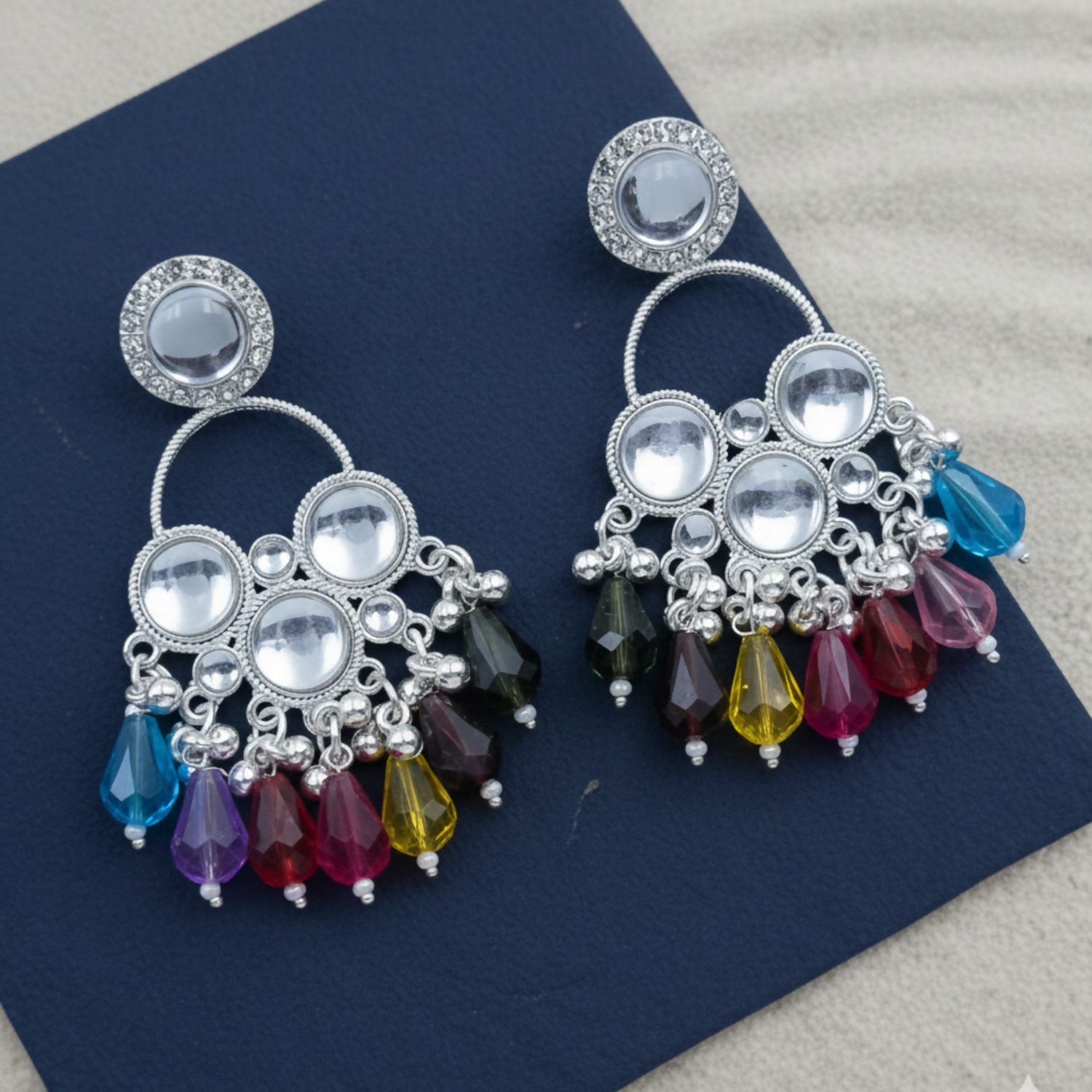 Design: Each earring features a circular stud and a crescent-shaped frame embellished with round, mirror-like Kundan-style stones and tiny crystal accents.