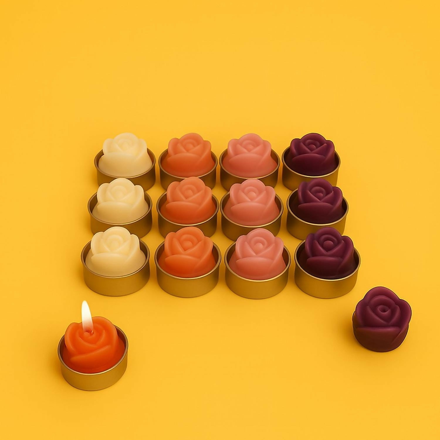 ✅ Set of 12 Rose Candles – Beautifully designed tea light candles in romantic multicolor shades.