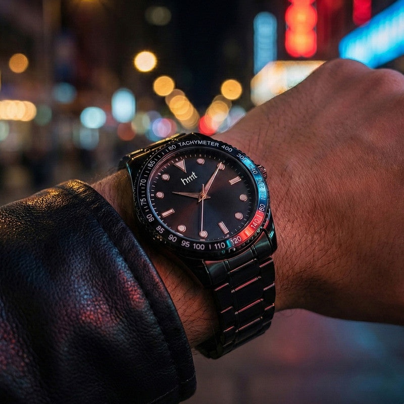 This classic analog wrist watch features a bold black dial paired with a tachymeter-style bezel for a strong and confident look. The clean marker layout ensures easy readability while adding a sporty yet refined character to the design. A durable black metal strap enhances its premium appearance and provides a secure, comfortable fit throughout the day. Designed for reliable everyday timekeeping, it blends modern styling with practical usability. The sleek finish makes it suitable for office wear, evening outings, and smart casual looks. A versatile wrist watch crafted for those who prefer a bold and elegant accessory.