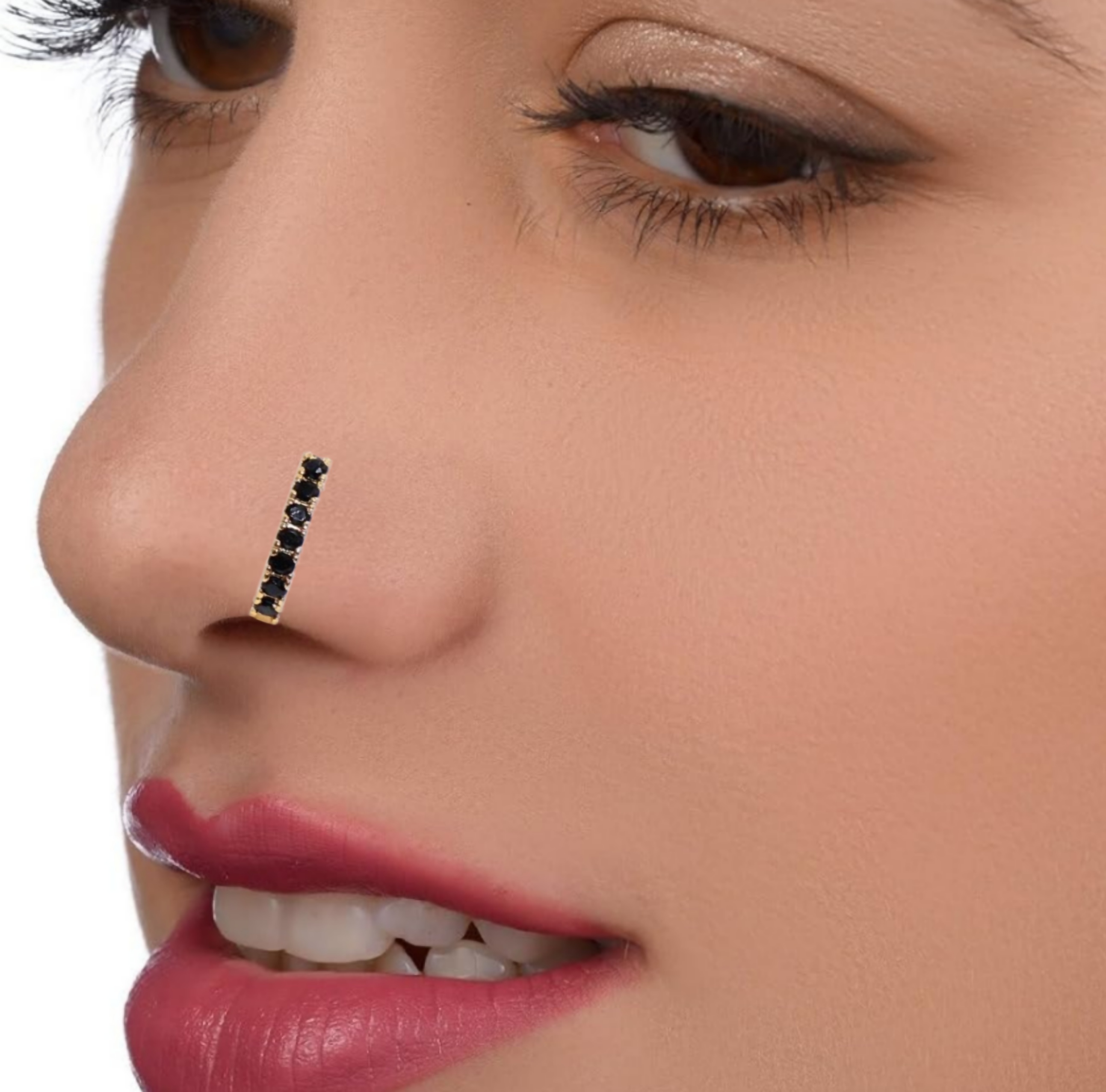 Add a touch of contemporary elegance to your look with this stunning Black Stone Bar Nose Pin. Featuring a sleek, straight line of glittering jet-black cubic zirconia (CZ) stones, this nose pin offers a chic, modern take on traditional nose jewelry. The beautiful gold-plated finish ensures a rich, premium feel.
