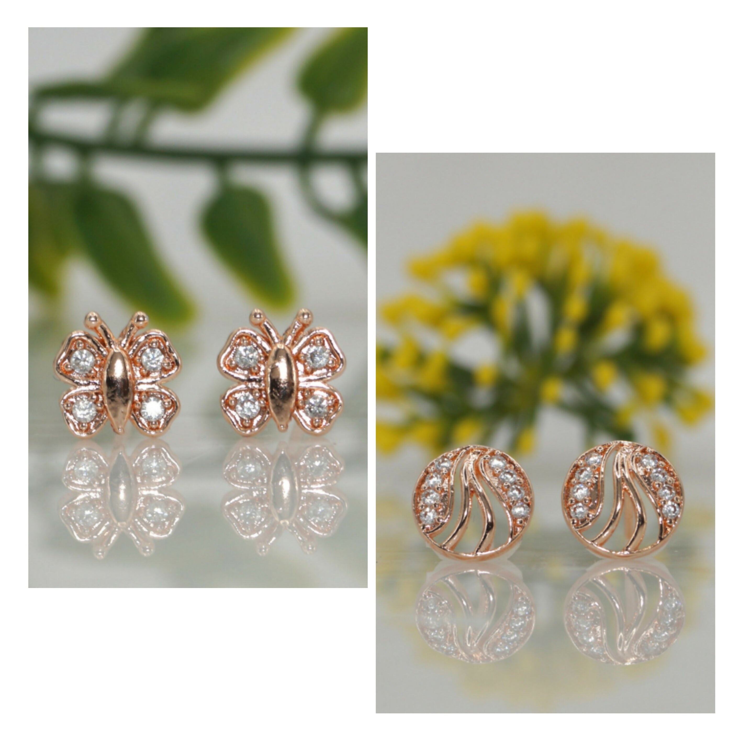 Rose Gold Plated AD Stud Earrings Set (Butterfly & Round) for women and girls Combo Pack of 2