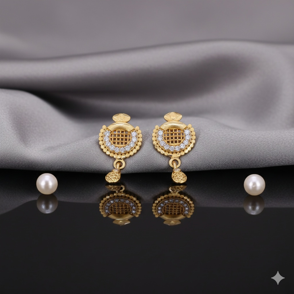 The main stud is beautifully framed by a half-halo of sparkling, premium Cubic Zirconia (CZ) stones, adding a touch of brilliant glamour that catches the light with every turn. A delicate, textured gold element dangles gracefully below, culminating in a shimmering accent.