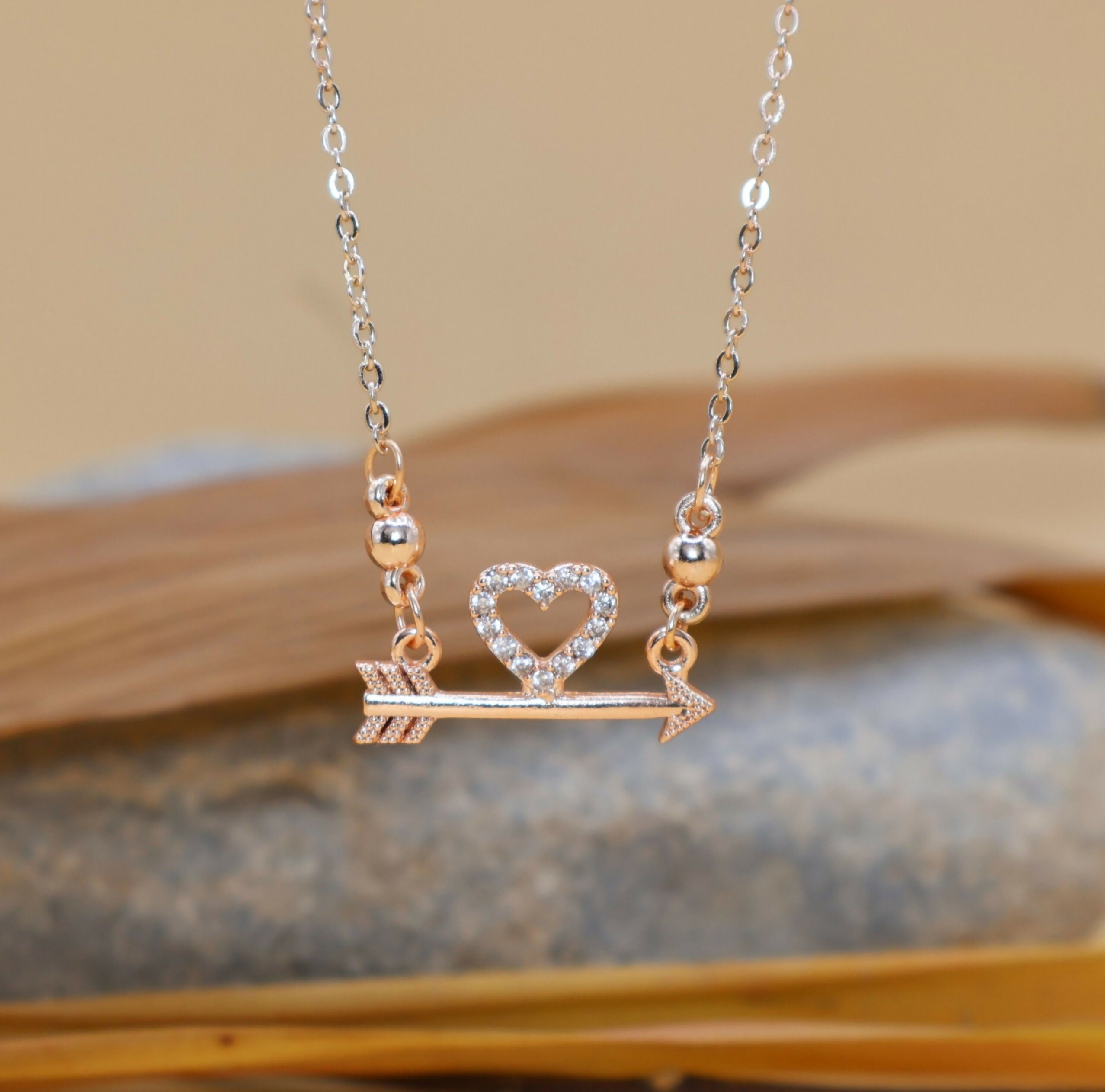 Capture the essence of romance with this beautiful and delicate Rose Gold Cupid Arrow Heart Necklace. Crafted from shimmering rose gold-tone material, this piece features a charming pendant depicting a Cupid's arrow pierced through a sweet, open heart.