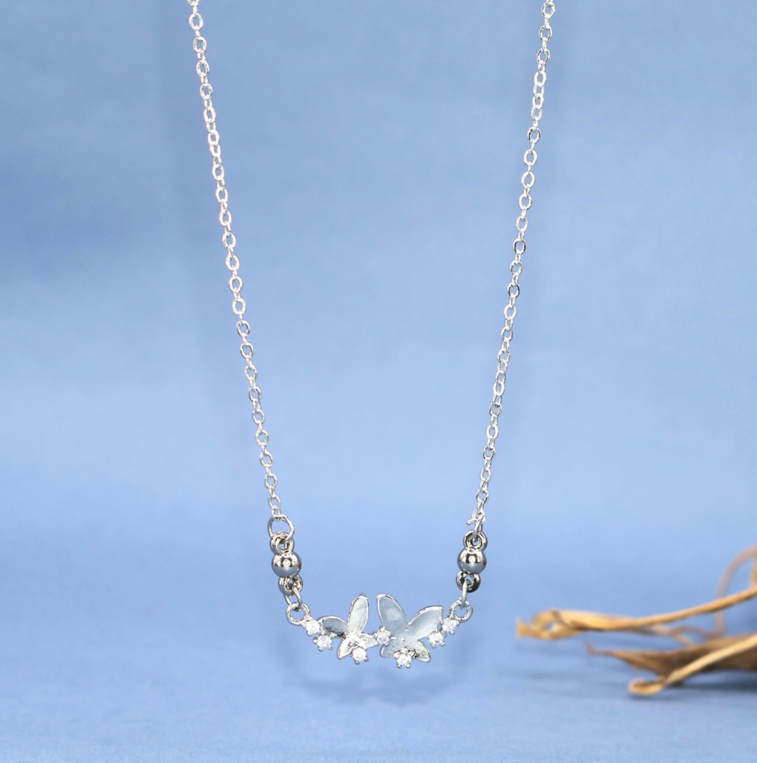 The butterflies are crafted in a gleaming silver-tone finish, with the wings of one or both subtly accented with sparkling, pave-set Cubic Zirconia (CZ) stones for a brilliant, eye-catching effect. The pendant is secured to a fine chain, beautifully accented with polished beads on either side, adding a refined touch to the design.