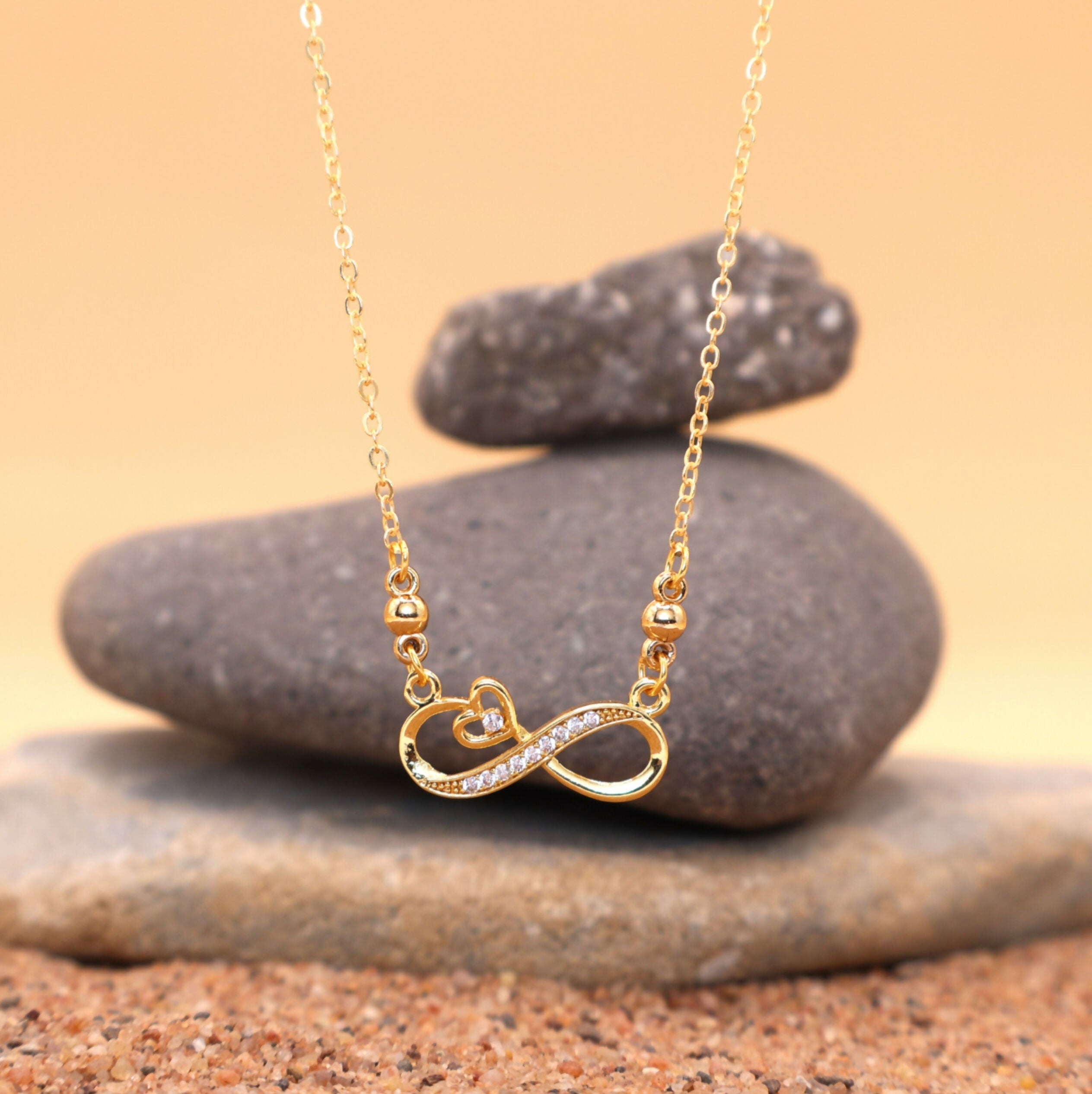 The infinity design is accented with dazzling Cubic Zirconia stones, adding a touch of brilliant sparkle that catches the light beautifully. The delicate gold-plated chain includes small, polished beads near the pendant, providing a subtle, sophisticated texture.