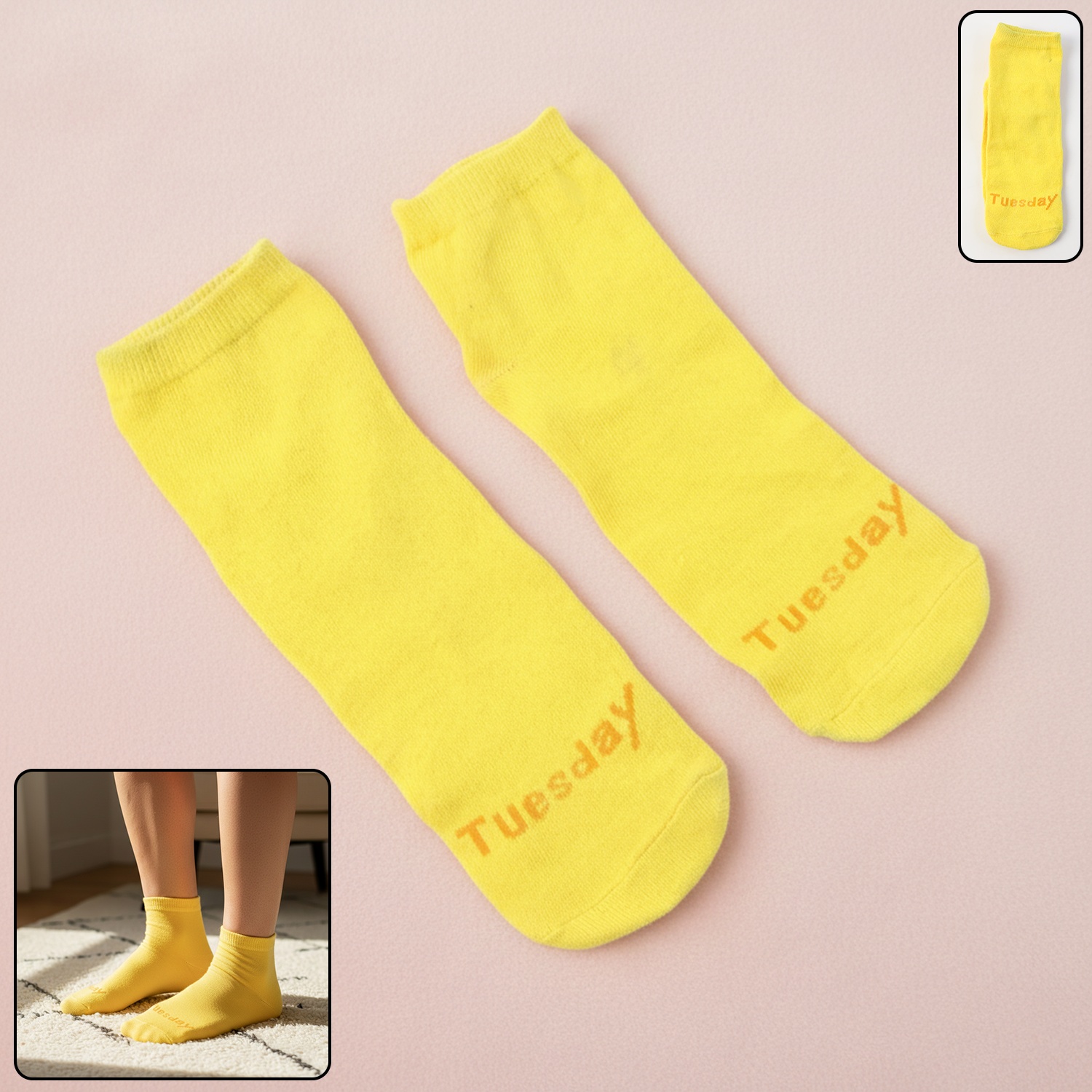 Tuesday theme yellow casual socks, yellow casual socks, themed socks for Tuesday, casual yellow socks, fun day socks, novelty yellow socks, weekday themed socks, comfortable casual socks, cotton casual socks, lightweight casual socks, unisex casual socks, fashion yellow socks
