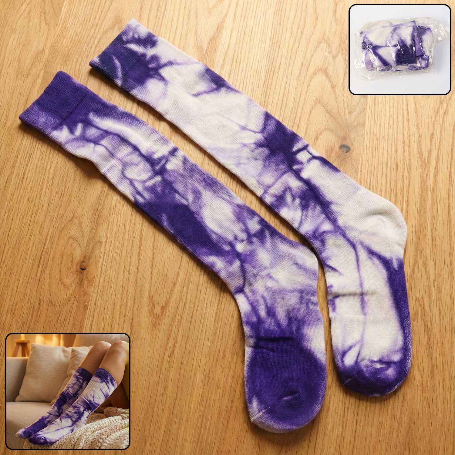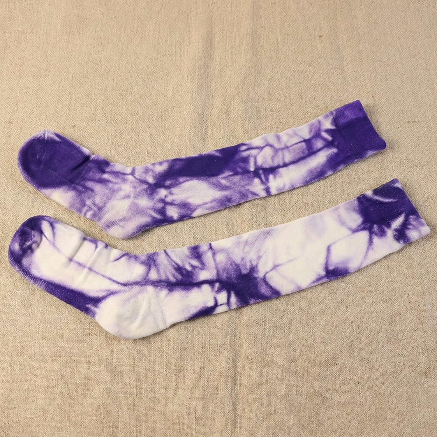 purple and white tie-dye long socks, tie-dye socks, long tie-dye socks, purple tie-dye socks, white tie-dye socks, colorful long socks, casual long socks, trendy socks, stylish tie-dye socks, cozy long socks, soft fabric socks, fashion socks, everyday wear socks, fun patterned socks